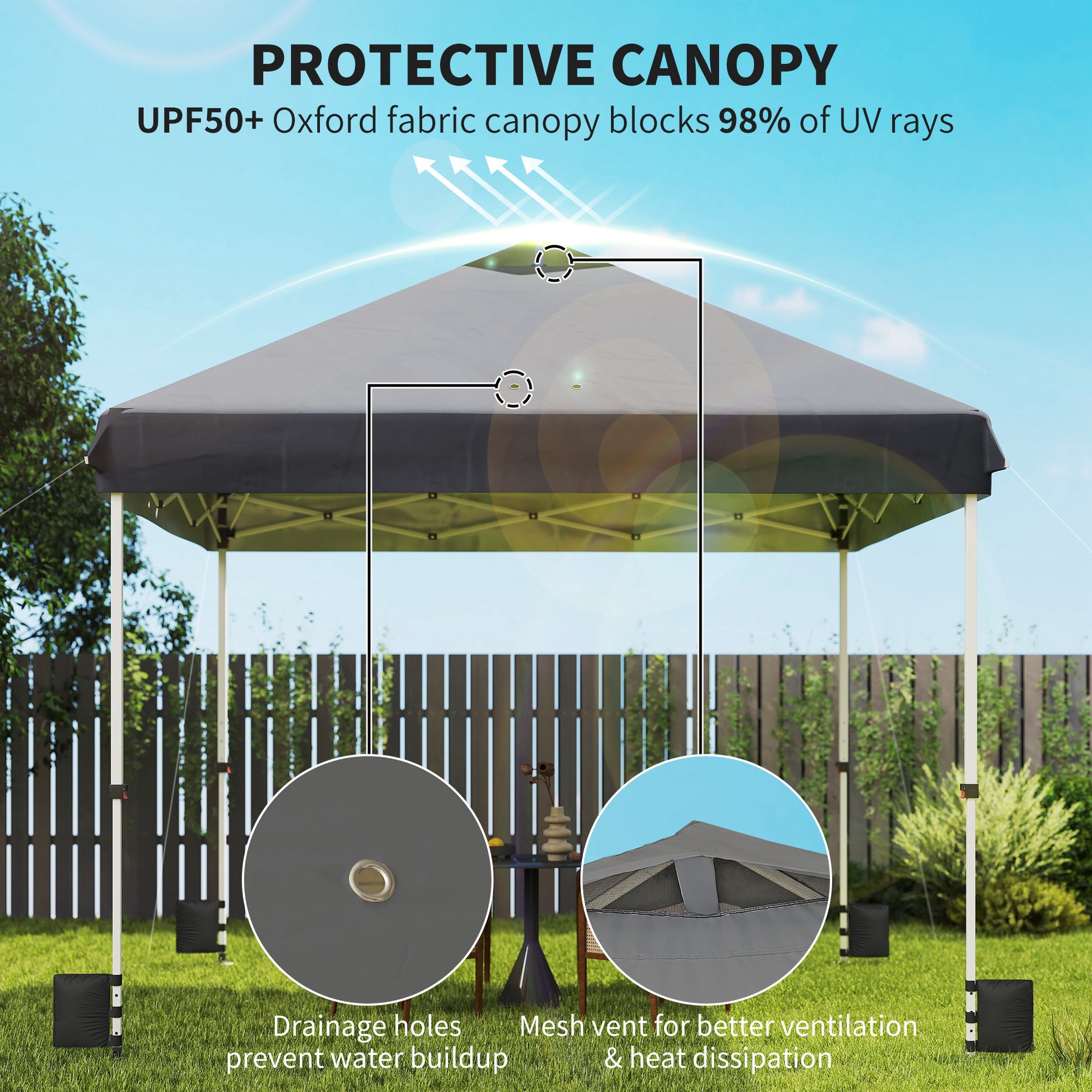 Create a cooler and more welcoming gathering space with this 3 x 3 m pop up gazebo, featuring a 210D Oxford fabric canopy with silver coating for UPF 50+ sun protection. Its powder-coated frame with guy ropes, stakes and sandbags keeps everything steady, while the intuitive pop-up design with a one-push central lock and built-in frame wheels allows you to quickly set the right atmosphere for garden parties, picnics, or relaxed weekend get-togethers.Specifications