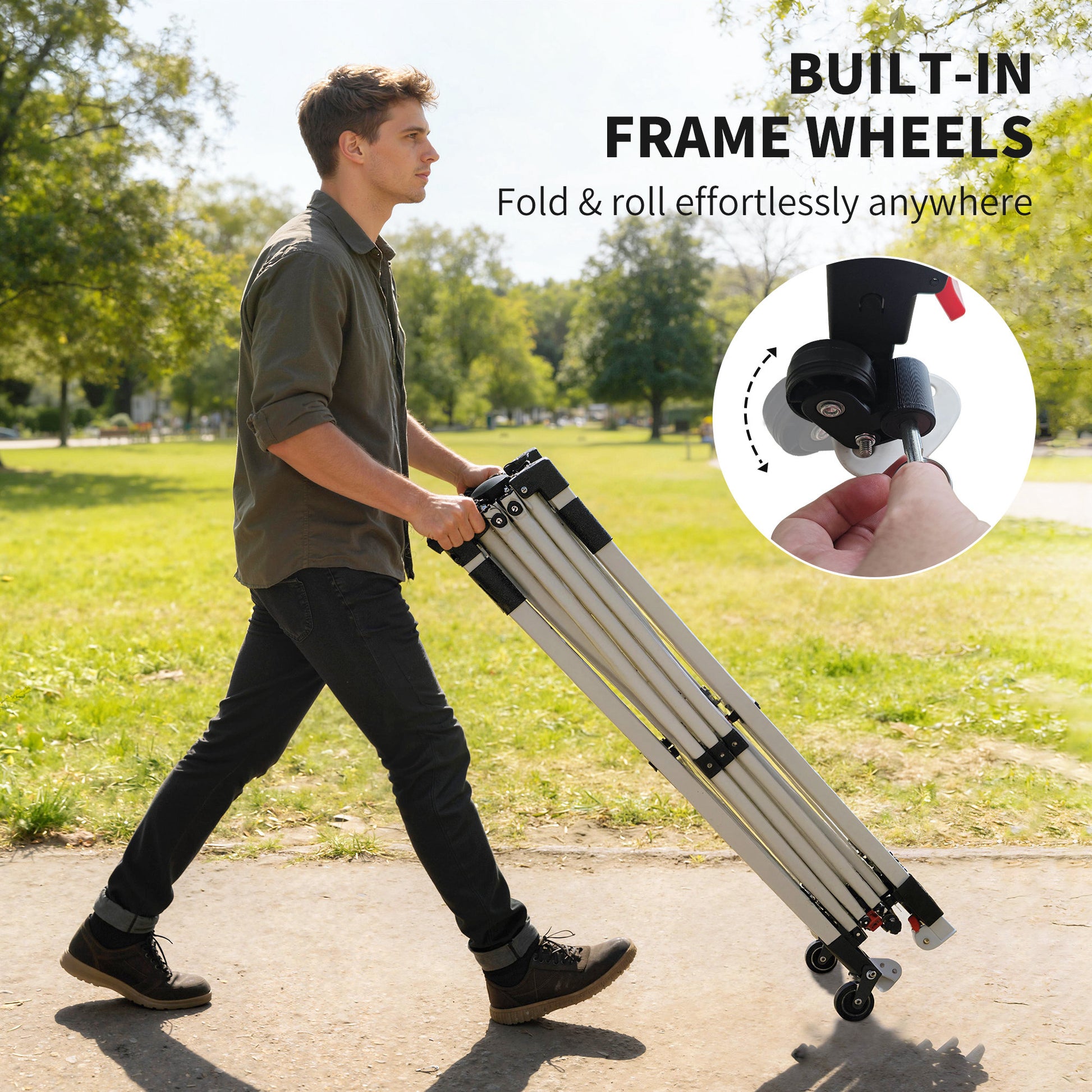 - Flip-down frame wheels makes movement of the folded frame quick and effortless