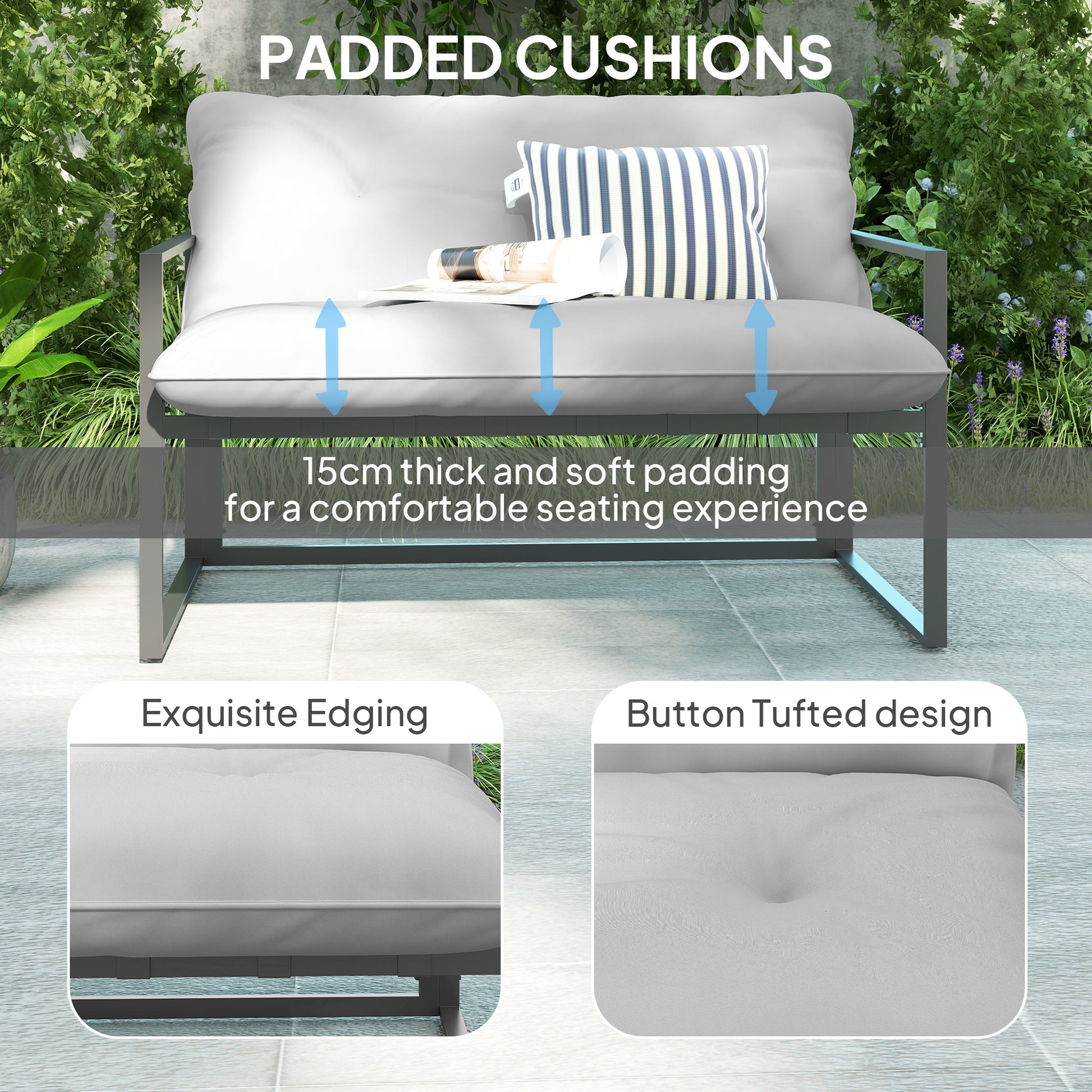 Let friends and family gather around in simple yet sleek style outdoors, thanks to this garden set. Comes with four pieces – two armchairs, a two-seater sofa and a dining tableall with steel frame for a tough and strong structure. Thick padded cushions on the seats and backs for comfort as you relax. A tempered glass on the long table adds a beautiful finish, with protective pads on each foot for balance.