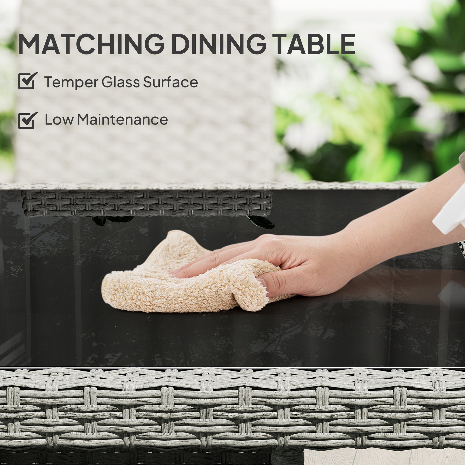 - Material: PE Rattan, Steel, Fibre cloth, Tempered glass, 3D vertical cotton