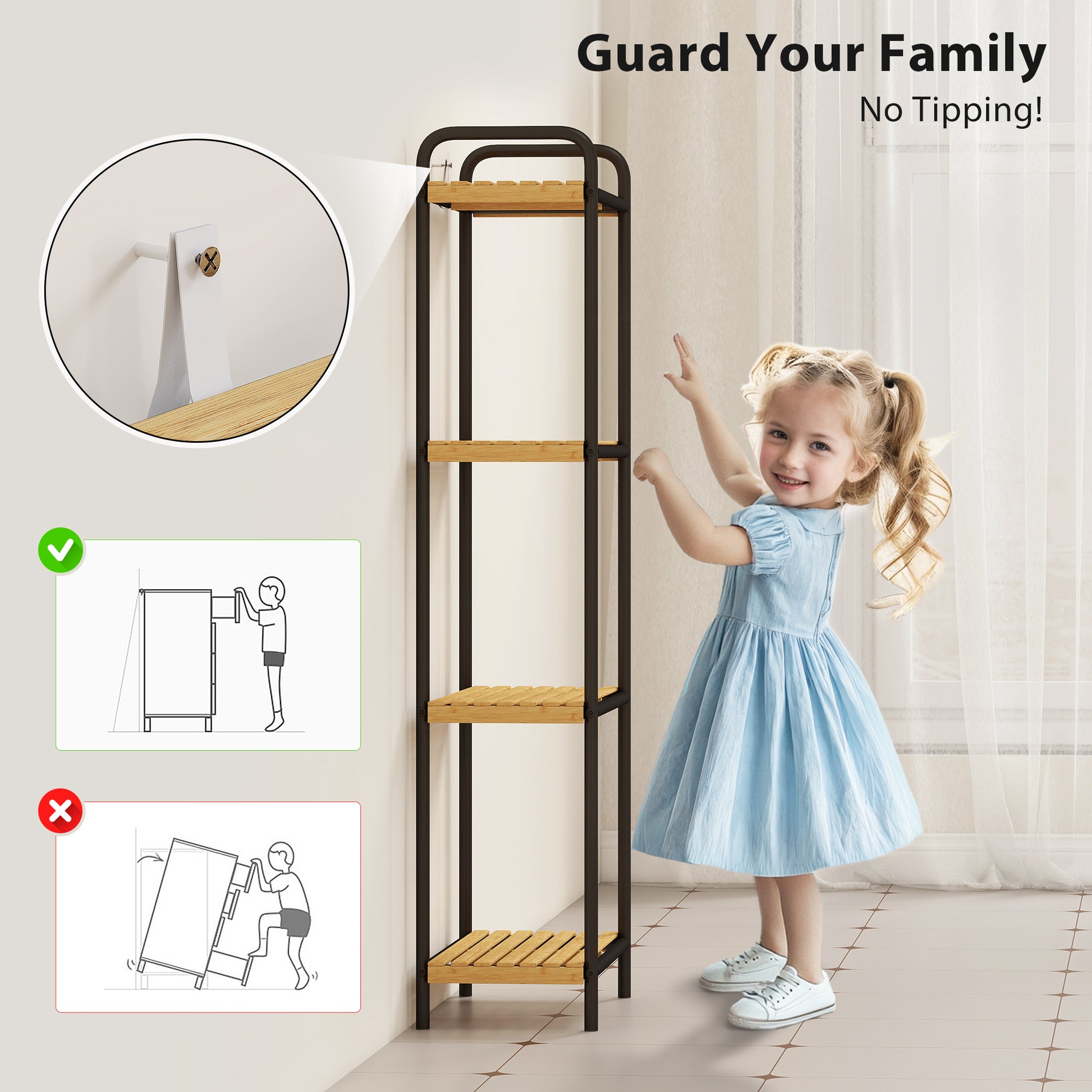 Transform your bathroom into a haven of safety and style with the freestanding bathroom shelf unit. Designed with anti-tip devices and a robust steel frame, it ensures peace of mind for families with little ones. Crafted from bamboo and steel with fresh varnish, it blends durability with natural aesthetics. Its four-tier slatted shelves offer lots of space to keep essentials organised and elevate your living experience.Specifications