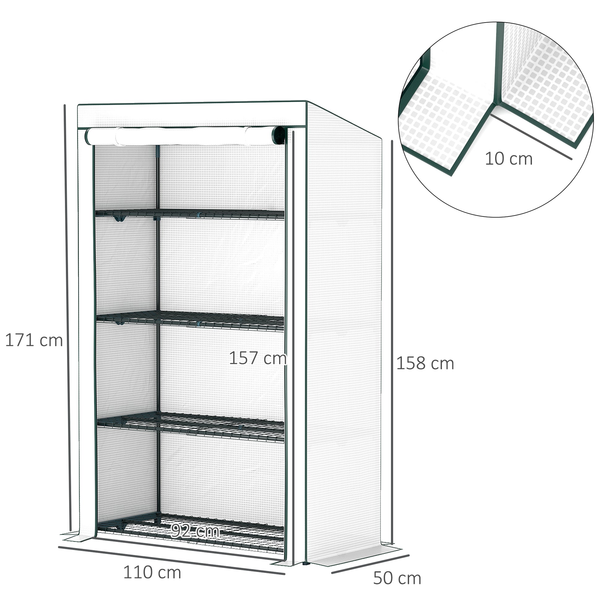 Transform your gardening with the Garden Greenhouse! This four-tiered lean-to greenhouse with shelves offers lots of space for flower pots and seed trays, enveloped by a 140g/m² PE cover that shields plants from UV damage while bathing them in sunlight. Plus, the roll-up zipped door ensures easy access and optimal ventilation. Great for any small greenhouse enthusiast looking to create a lush portable garden oasis!Specifications