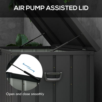 Tough metal outdoor storage comes in the form of this lockable garden storage box. The 450L capacity offers plenty of holding room for furnishings, garden accessories, tools and more. Made from thick steel, this waterproof storage box is strong, with an air pump on the lid for smooth, easy opening and closing. It comes with two handles and two wheels so you can move it around easily, whether empty or full.Specifications