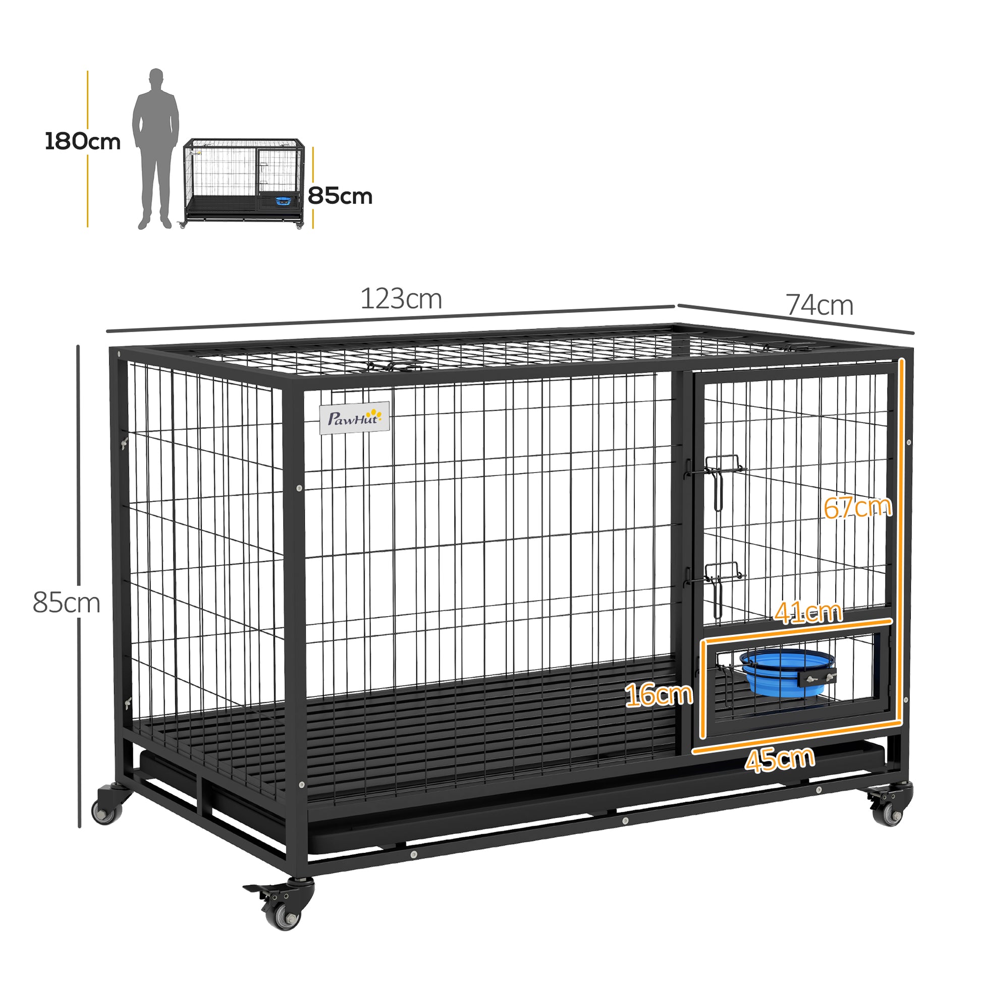 - Overall dimensions: 85H x 123L x 74Wcm. Inside cage: 67H x 123L x 74Wcm. Front door: 67H x 45Wcm. Small door: 16H x 41Wcm. Bowl size: 7H x Φ17cm. Capacity: 0.9L. Tray: 3.5H x 118L x 70Wcm. Frame bar spacing: 5.5cm. Bottom bar spacing: 2cm