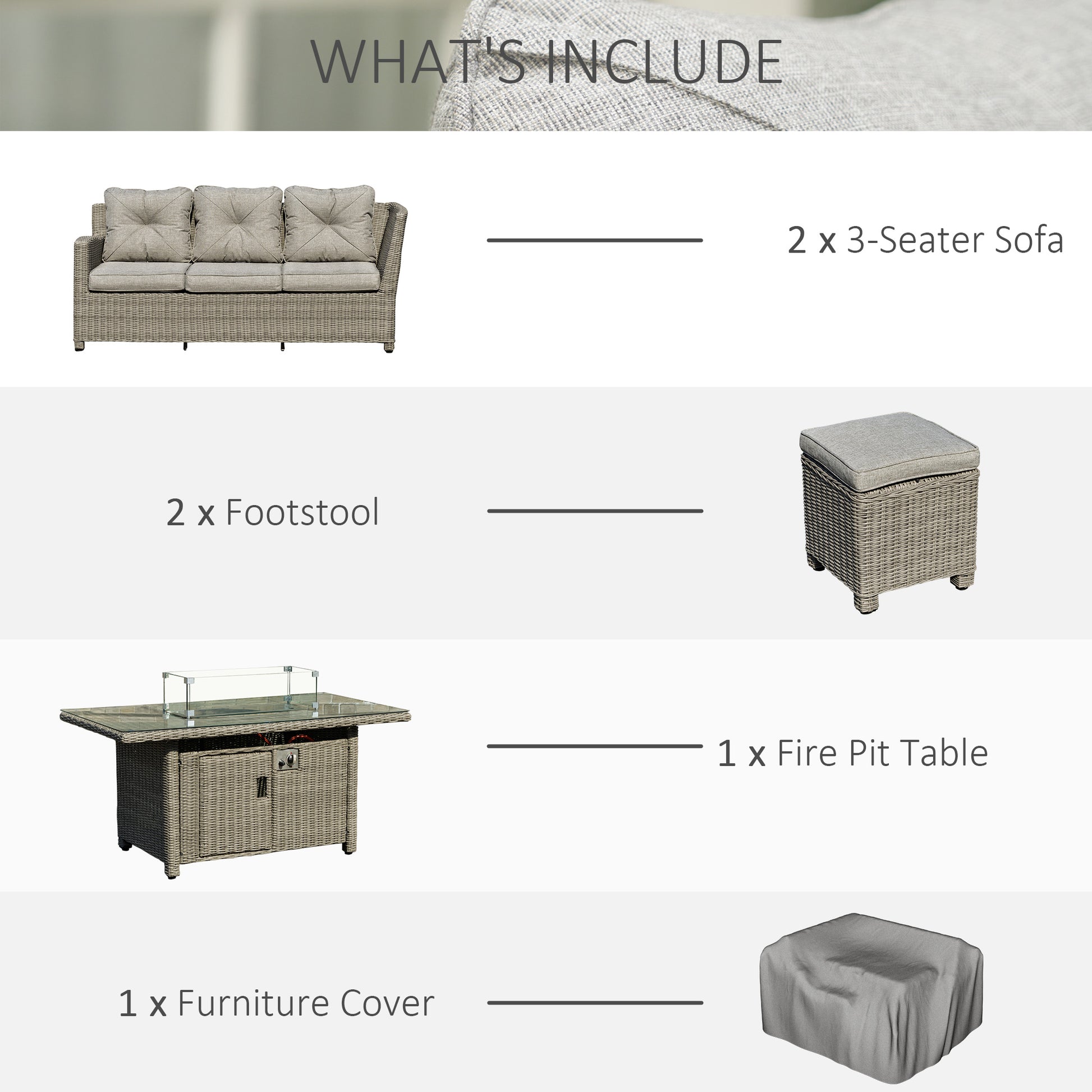 - Set includes two 3-seater sofas, two footstools and a gas fire pit table
