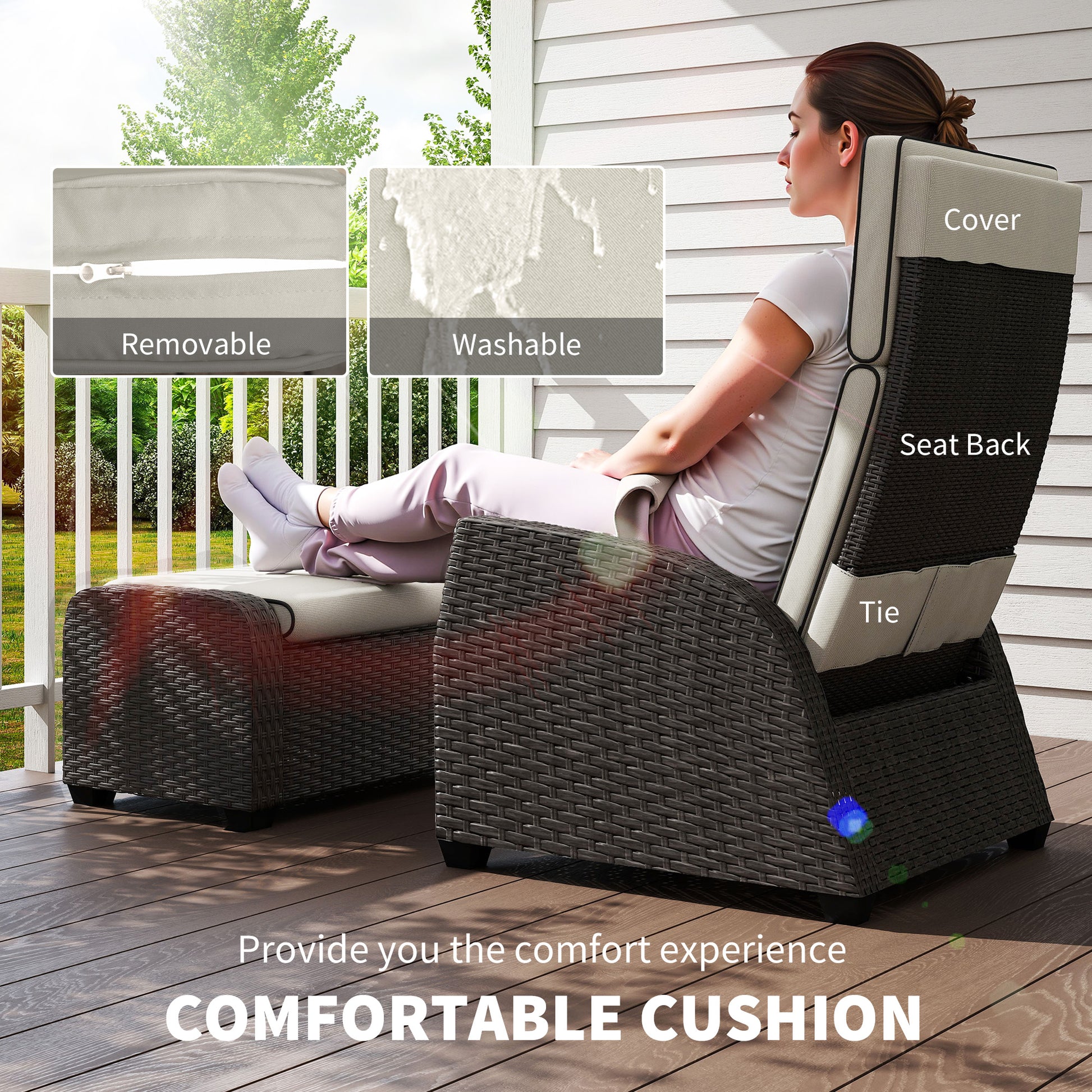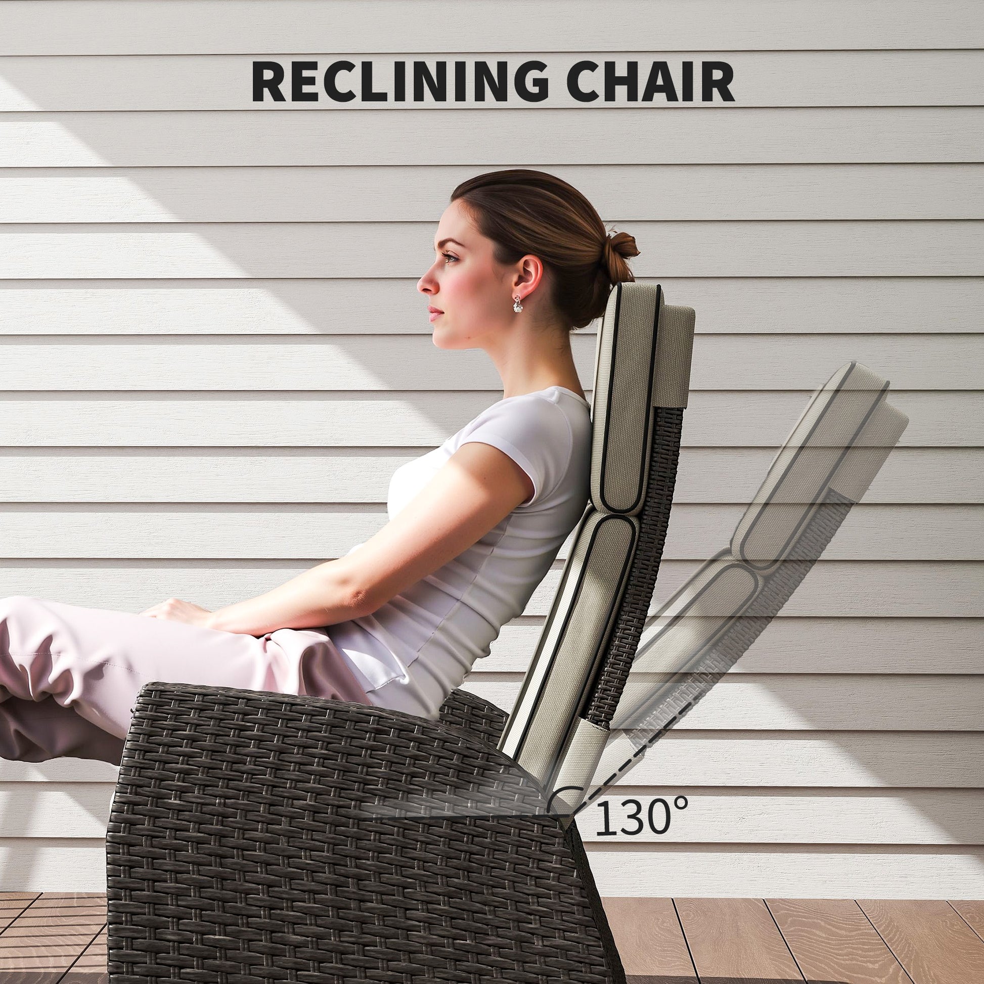 Rest and relax with company, with this Outsunny conservatory furniture. Five pieces - two reclining chairs, two footstools and a matching coffee table so you can relax with company. The two chairs have 130° reclining backs, with padded cushions for comfort. Each piece has a powder coated steel frame for a strong core, wrapped in plastic wicker for extra durability and style. Complete with adjustable feet for balance.Specifications