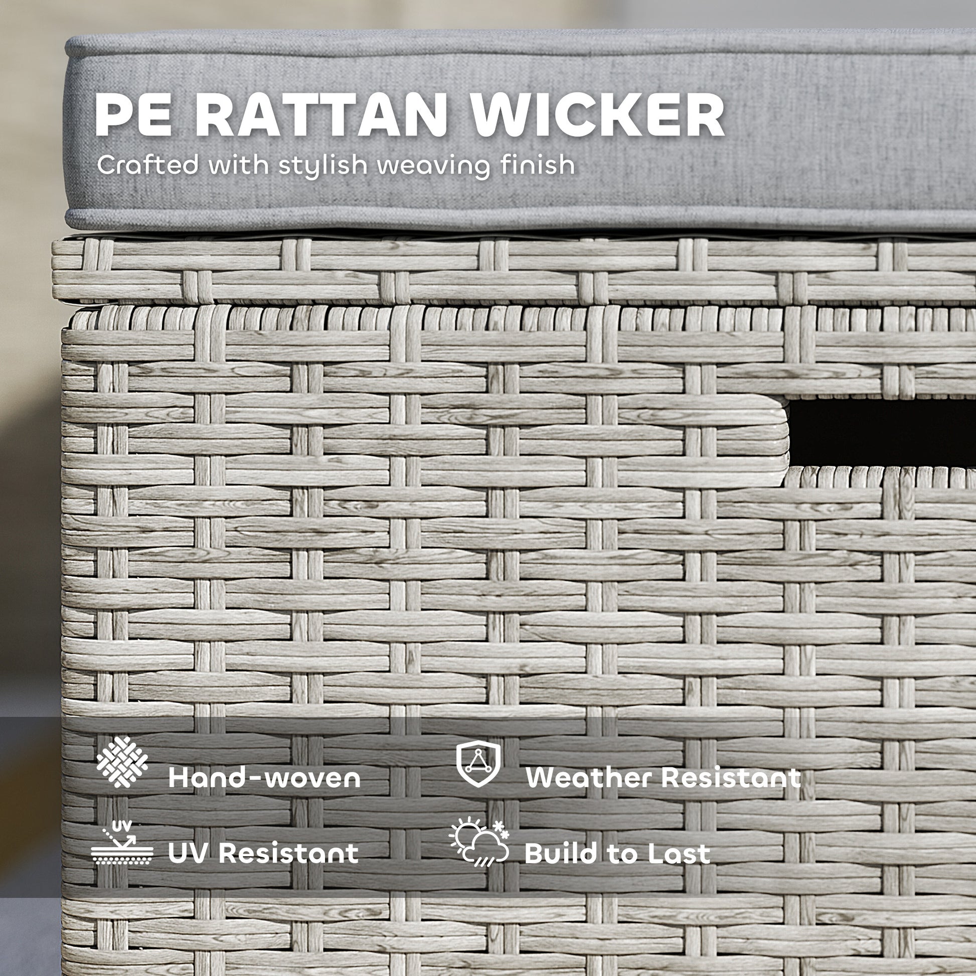 An inviting outside, all day long with this Outsunny garden rattan furniture set, including two single-arm chairs, two footstools and a matching table - set up how you want for morning coffee or lounging. Steel frames mean a strong core wrapped in protective plastic rattan. The outdoor rattan furniture set complete with seat and back cushions for plenty of comfort. A functional table with storage keeps essentials close at hand, topped with wood grain slats, adding a practical and stylish touch.Specifications