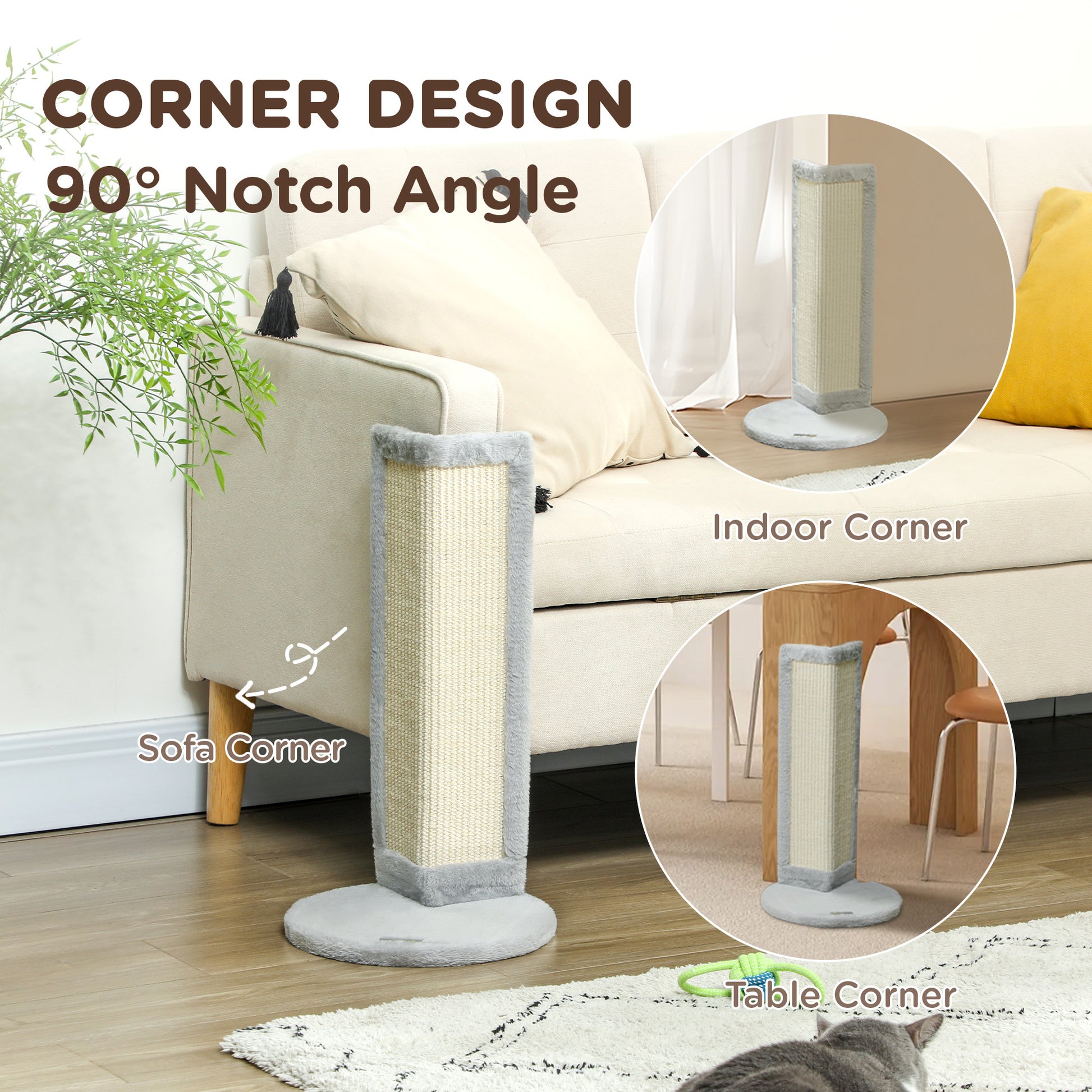 Discover the cat scratch post for indoor cats, ingeniously designed to fit snugly in any corner with its 90° notch. This corner cat scratcher meets your feline's natural clawing instincts, covered in robust sisal and soft plush. Its large, stable base ensures it stays put during even the most enthusiastic scratch sessions, making it a must-have for indoor cats.Specifications