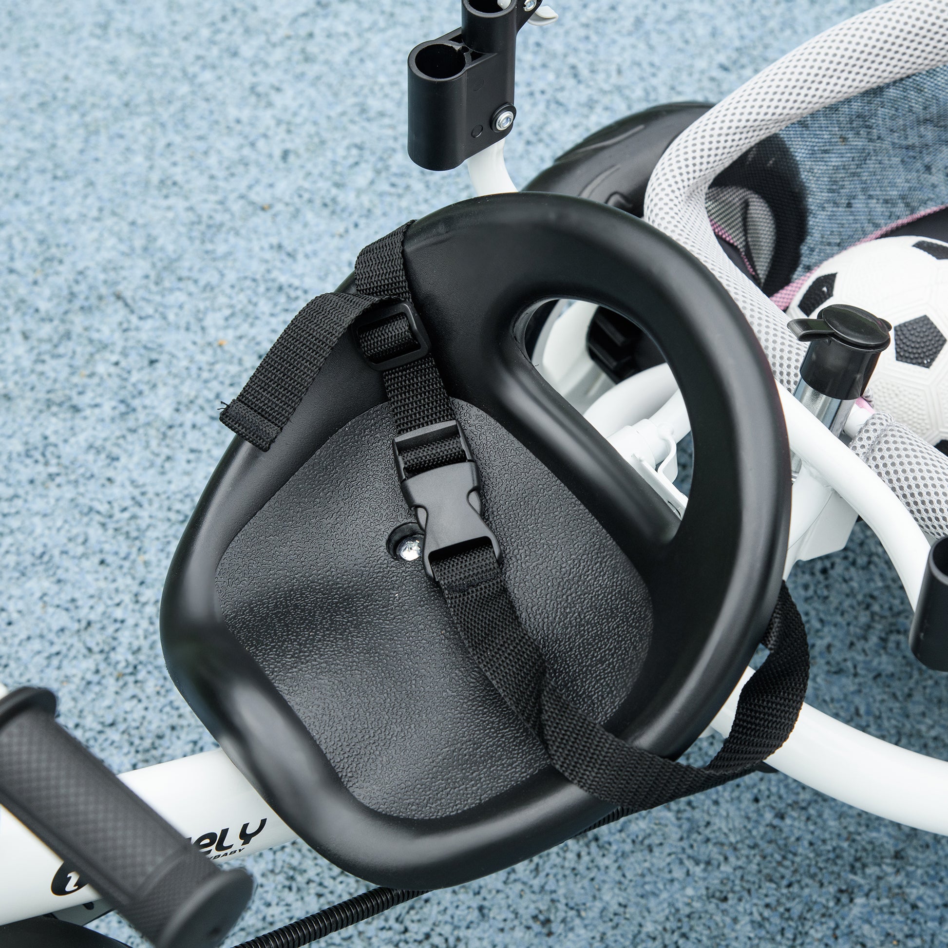 - Seat with a guardrail and 5-point seat belt safety belt to keep your child strapped in