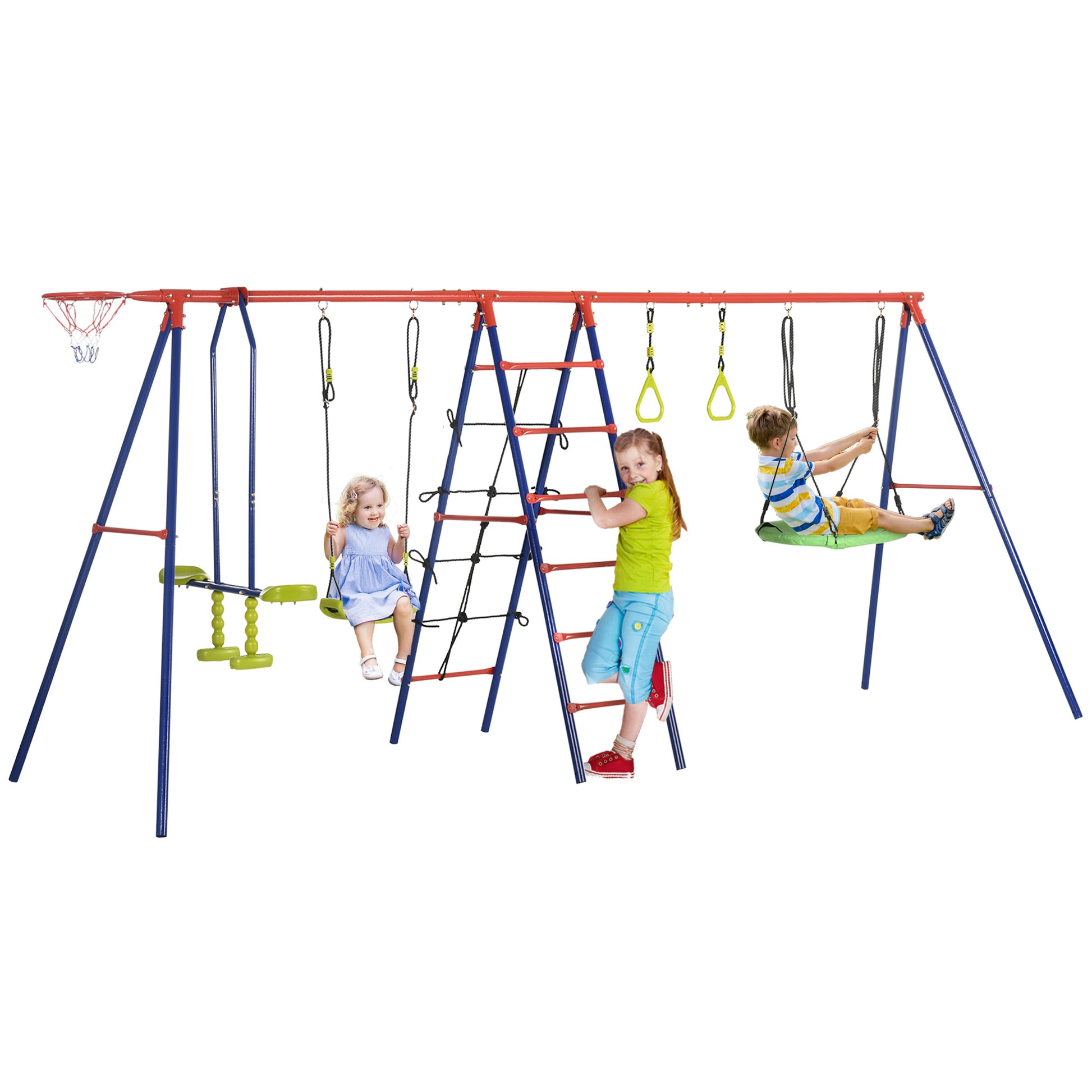 6 In 1 Metal Garden Swing Set, Kids Swings with Double Swings, Climbing Frame, Glider, Trapeze Bar, Basketball Hoop