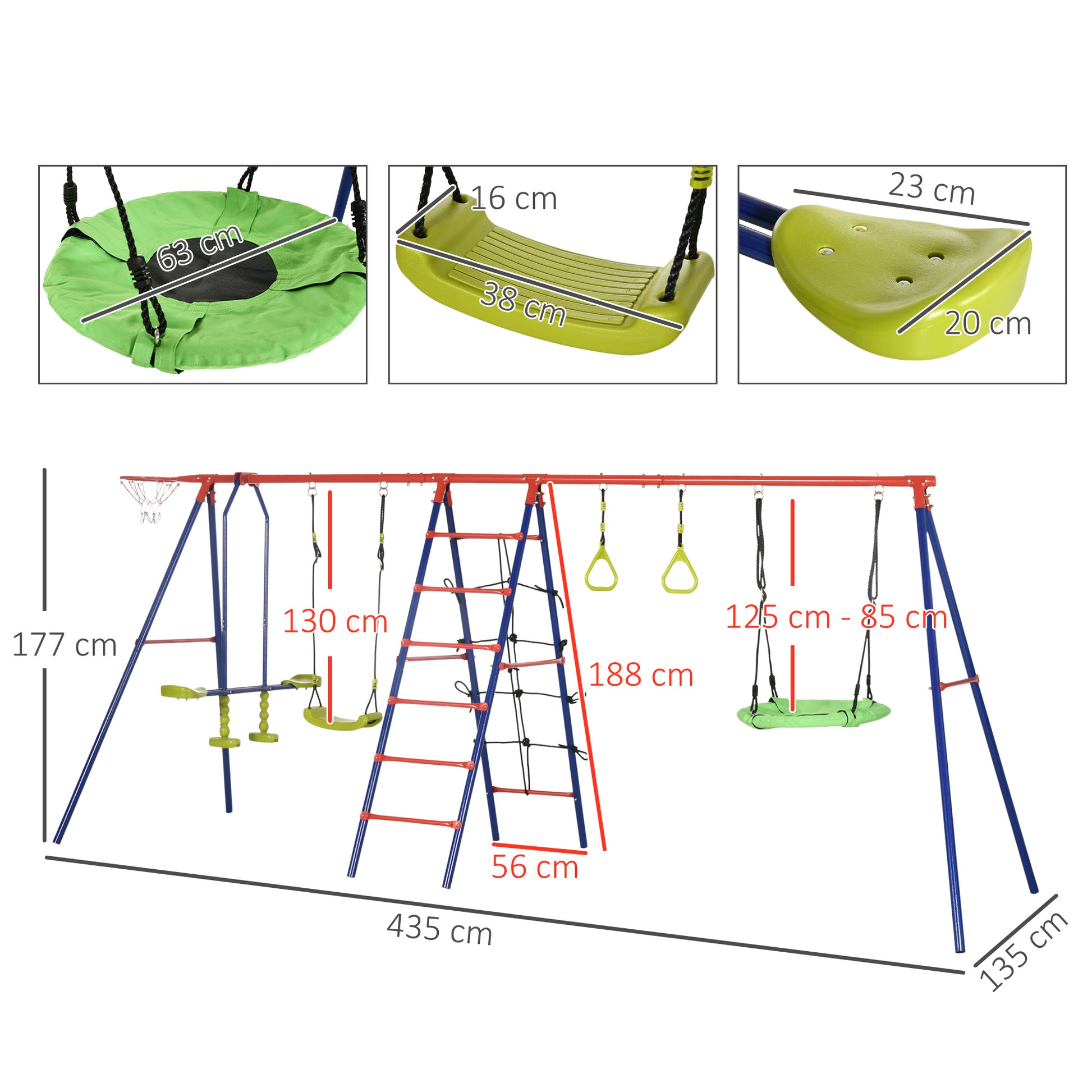 - Dimensions: 177H x 435L x 135Wcm. Maximum load: Each swing, glider and climbing ladder: 50kg.