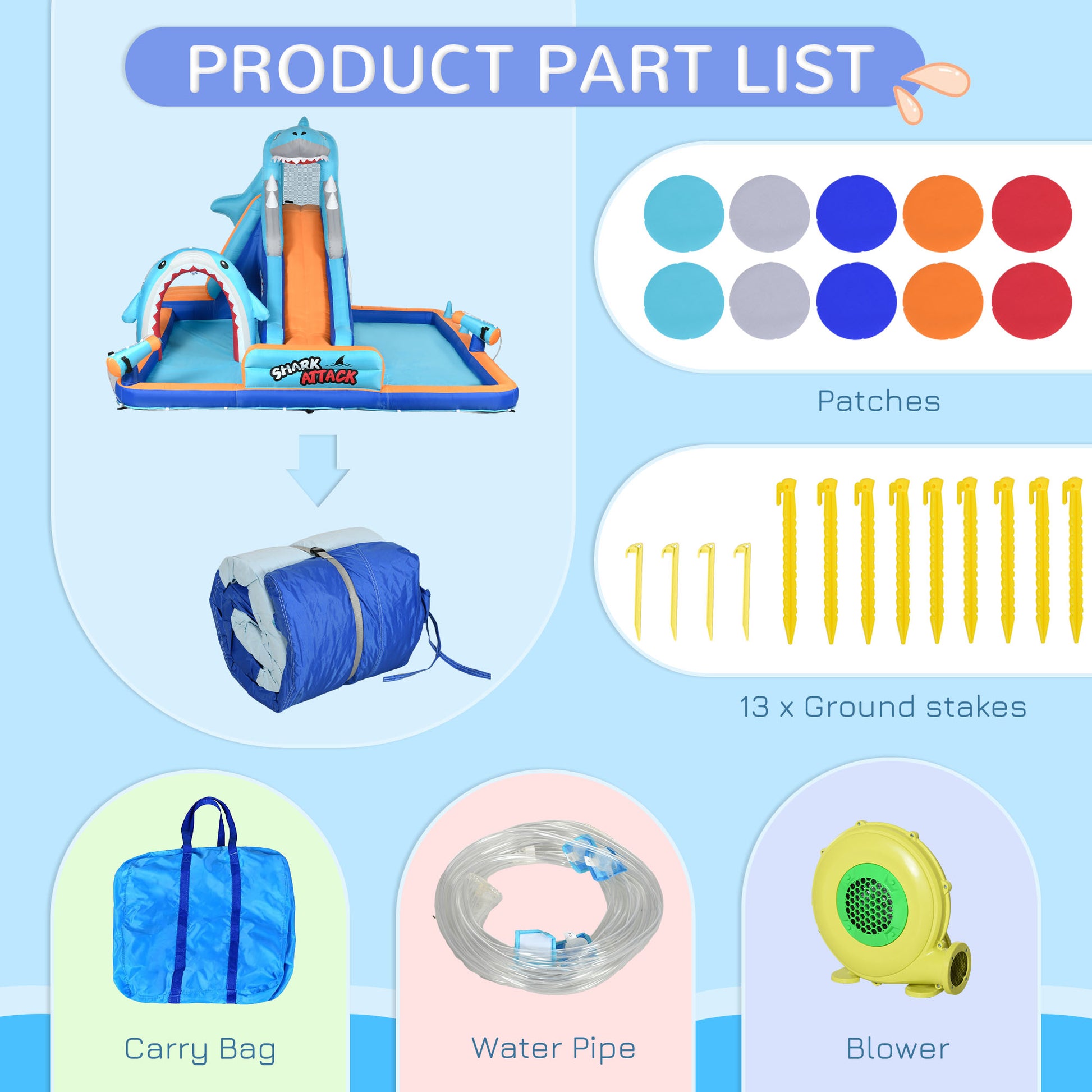 6 in 1 Shark-Themed Bouncy Castle, Inflatable Water Park, with Slide, Pool, Trampoline, Blower, for Ages 3-8 Years