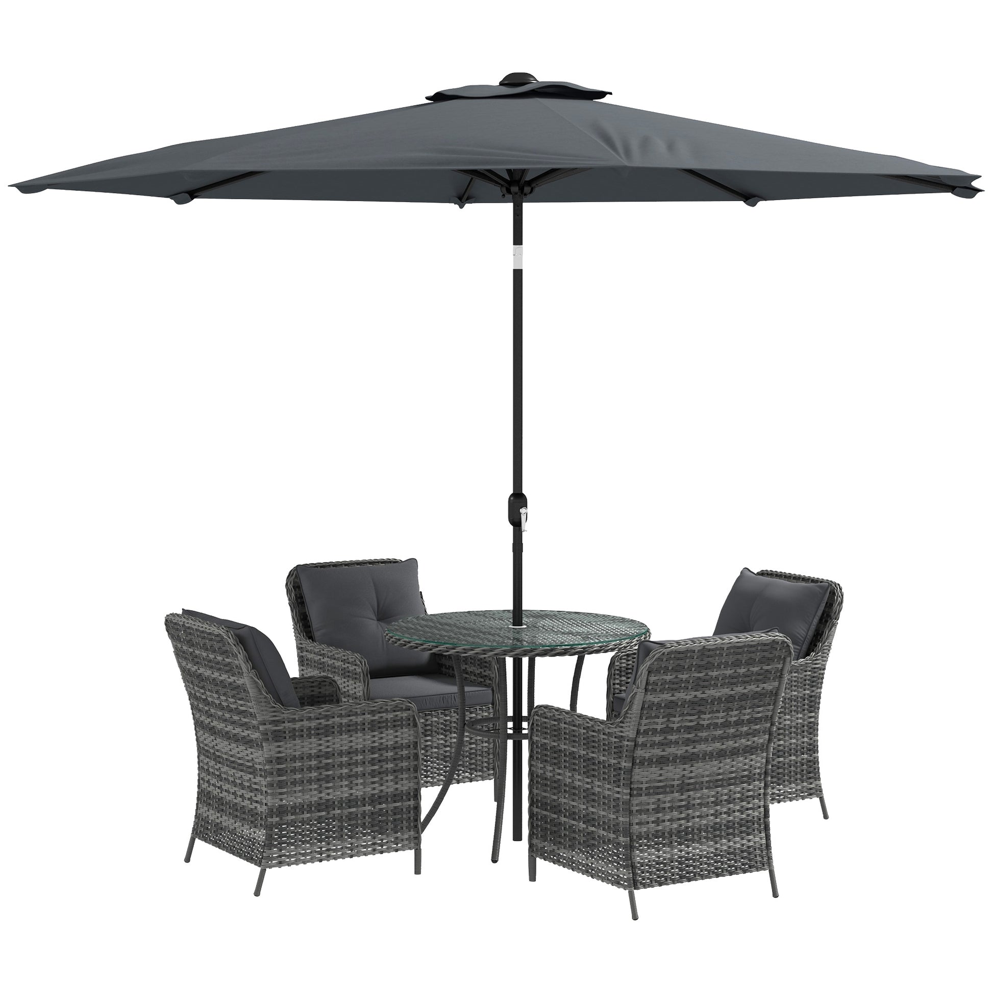 - Six-piece rattan garden dining set: comes with round table, garden umbrella and four dining chairs