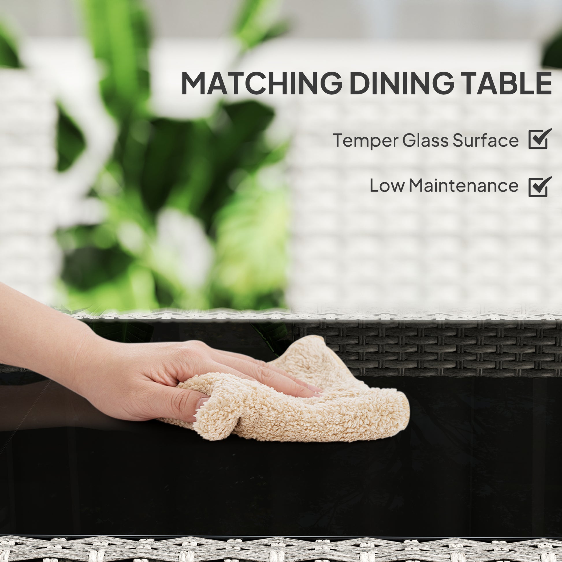 Comfortable and stylish dining with this Outsunny seven-piece dining set. Comes with six chairs and a spacious table. Each piece has a steel frame for a strong core, wrapped in protective plastic wicker for a forever-stylish rattan look. Complete with padded seat cushions for comfort, with washable covers for hygiene.Specifications
