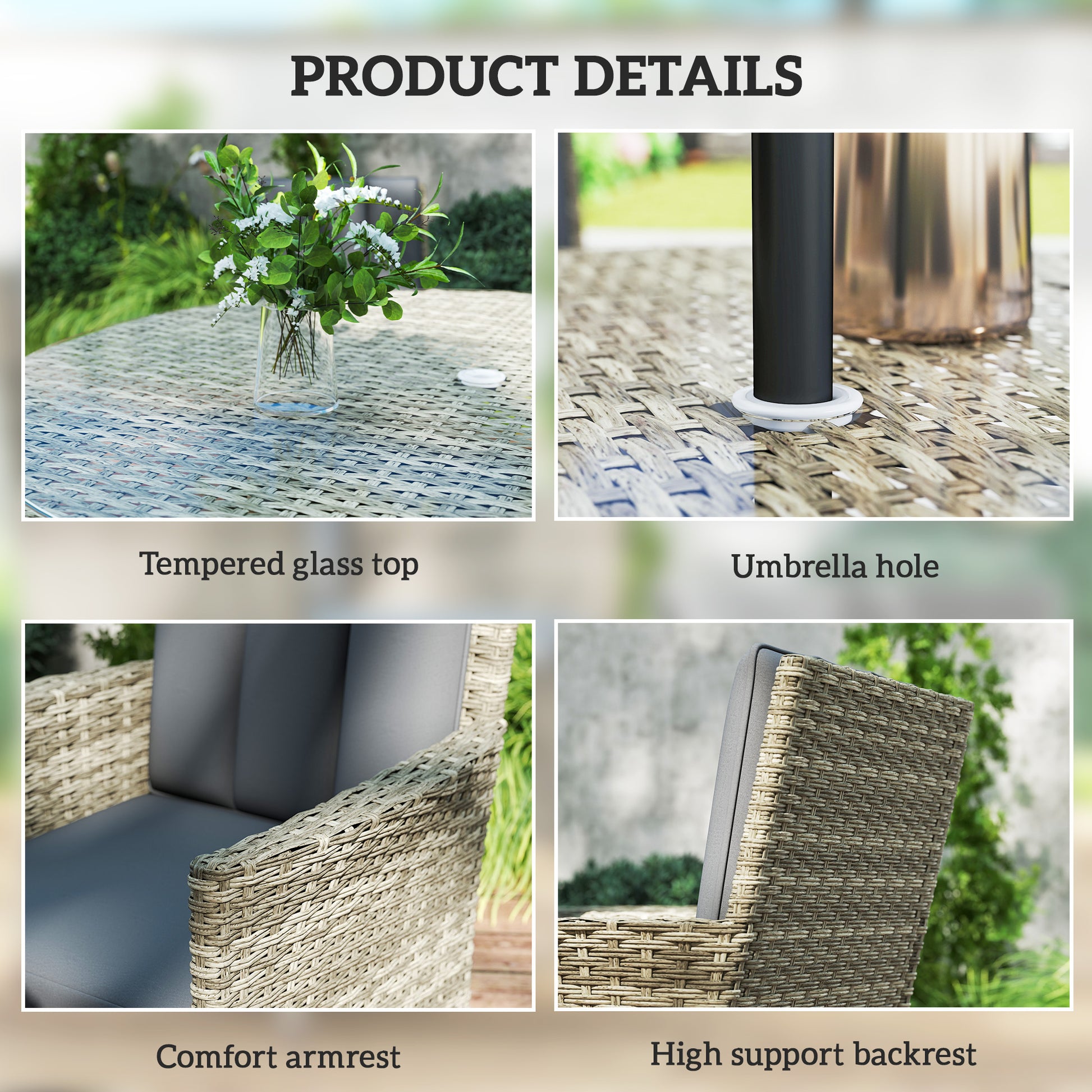 Create a flawless patio with this rattan dining set. The powder-coated aluminium frames mean strong frames, wrapped in stylish and protective plastic rattan. The high backs and armrests support your body as you sit, with padded cushions for comfort. The outdoor dining table and chairs set is complete with a glass-top table, with Φ4.2 cm middle hole to hold parasol in place.Specifications