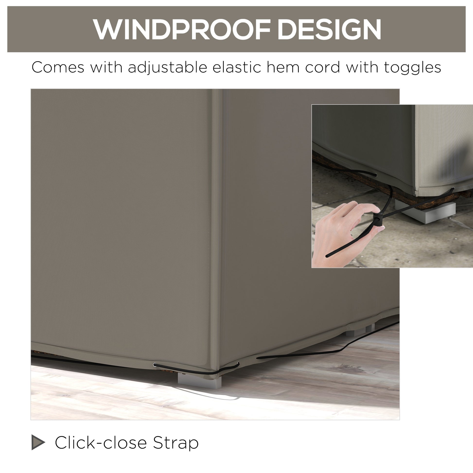 - WINDPROOF: Nylon drawstring with a fastener to provide an additional fix. So your garden table cover stays on during the windiest of days.