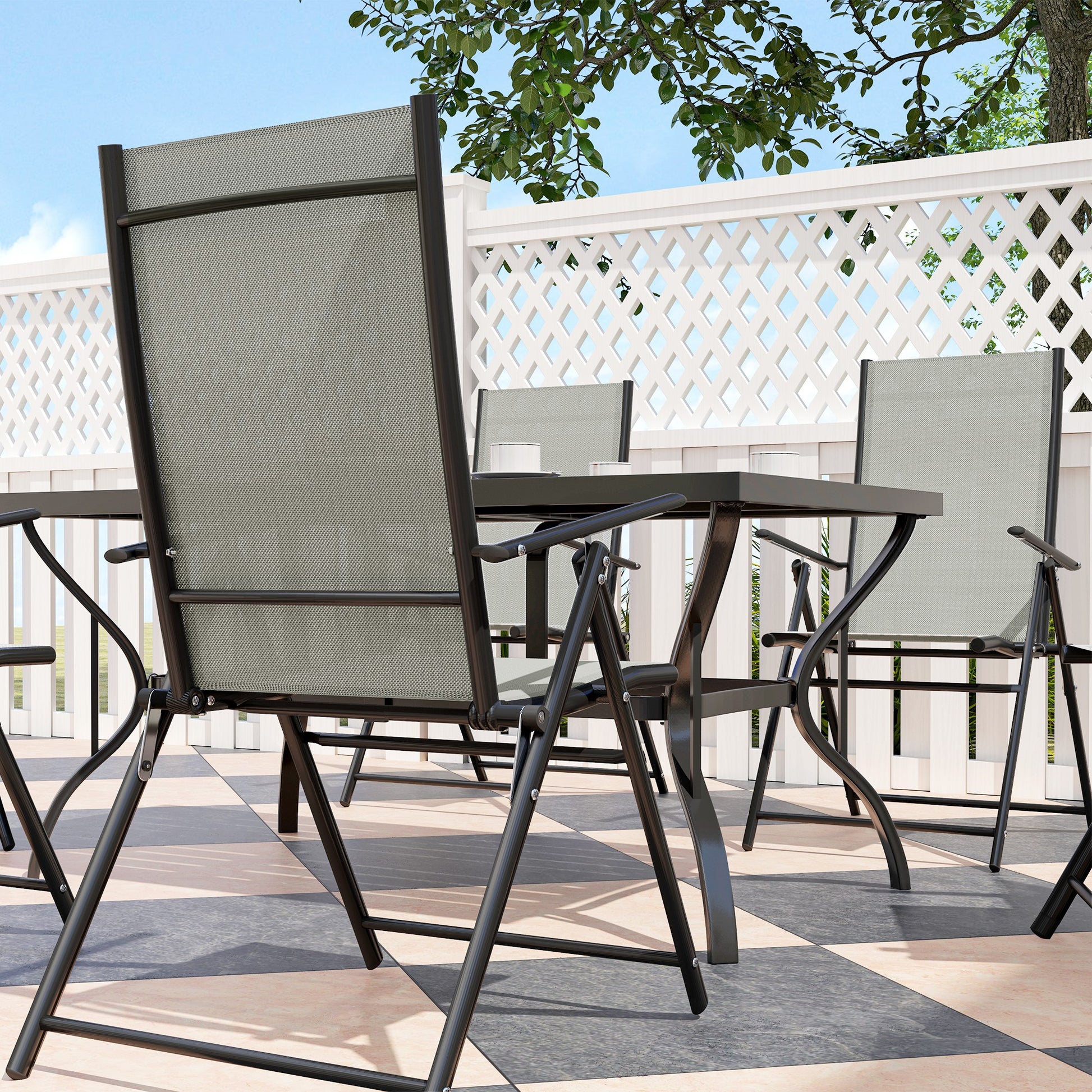- Patio furniture set comes with a rectangular dining table and six matching folding chairs