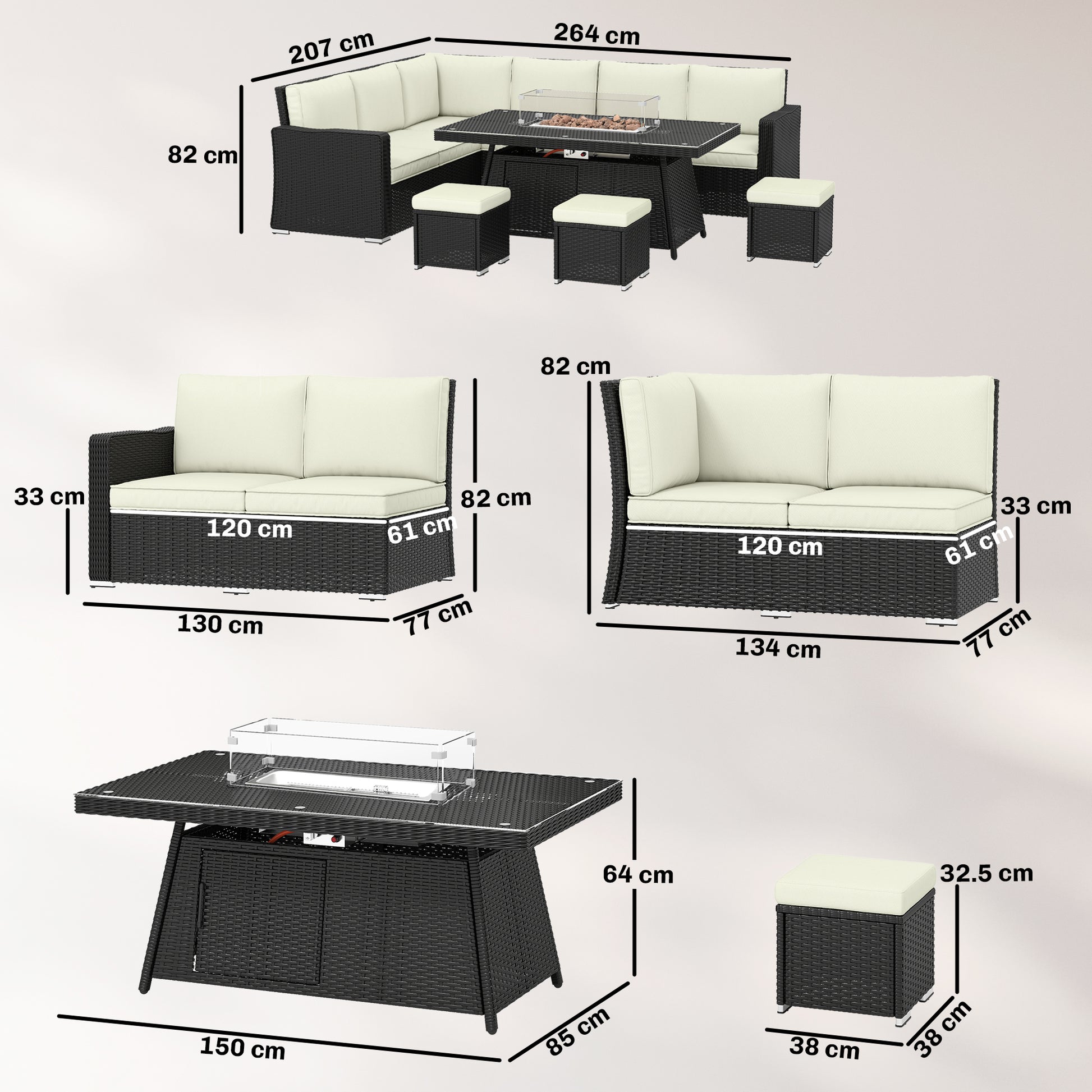 Relaxing evening times need never be cold again, do it in one with this rattan set. The two corner loveseats, standard loveseat, three footstools and matching fire pit table mean there's room for your favourites to gather round, with the table giving you somewhere to eat and drink from. In the middle of the table, there's a fire pit: provides up to 50,000 BTU power - plenty of heat for the colder climes. There's a wind guard for the fire, so you can keep peace of mind, at all times.Specifications