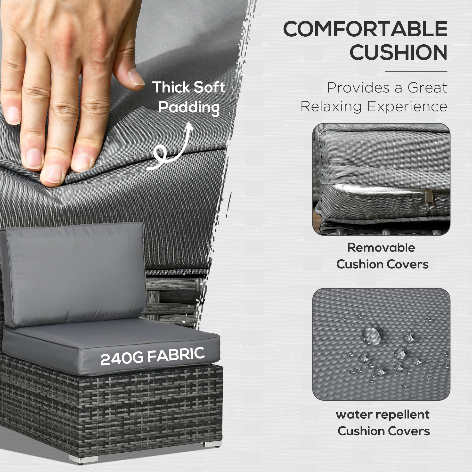 - Thick cushions: Relax in complete comfort as you relax on this corner garden furniture set. Four bright coloured throw cushions included.