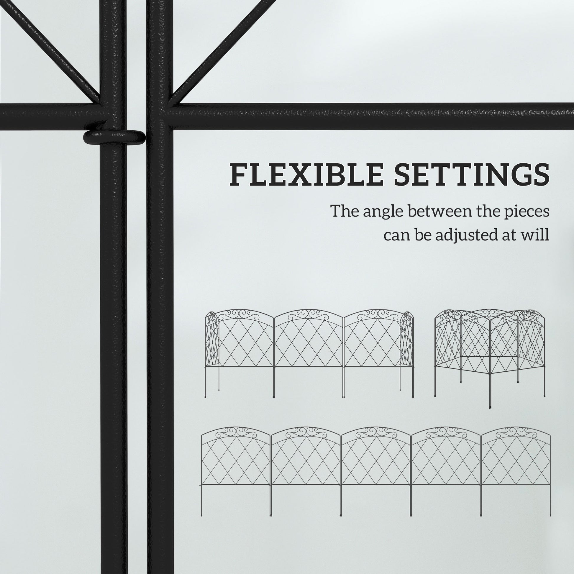 A beautiful and practical fence which can easily be shaped to suit you: this piece is a great entrance to your home. 3 m long, each panel can be flexed to a different position, making it great for obscure shaped areas. Made from metal for a strong structure, the powder coating offers extra protection and strength. The inner gridding and top circles create a pretty look.Specifications