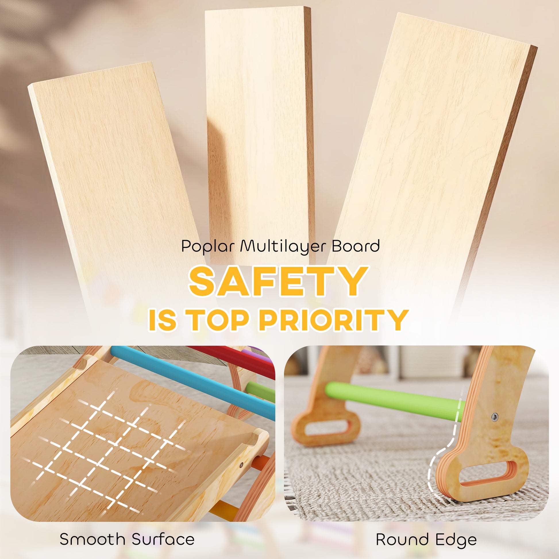 The kids climber offers nine exciting activities in one, great for channelling restless energy into fun playtime. It features climbing, crawling, sliding, rocking and drawing, keeping kids active while enhancing motor skills and coordination. The slide board connects to the ladder or arch, creating varied angles and new challenges. Bring the playground indoors with this versatile climbing frame set.Specifications