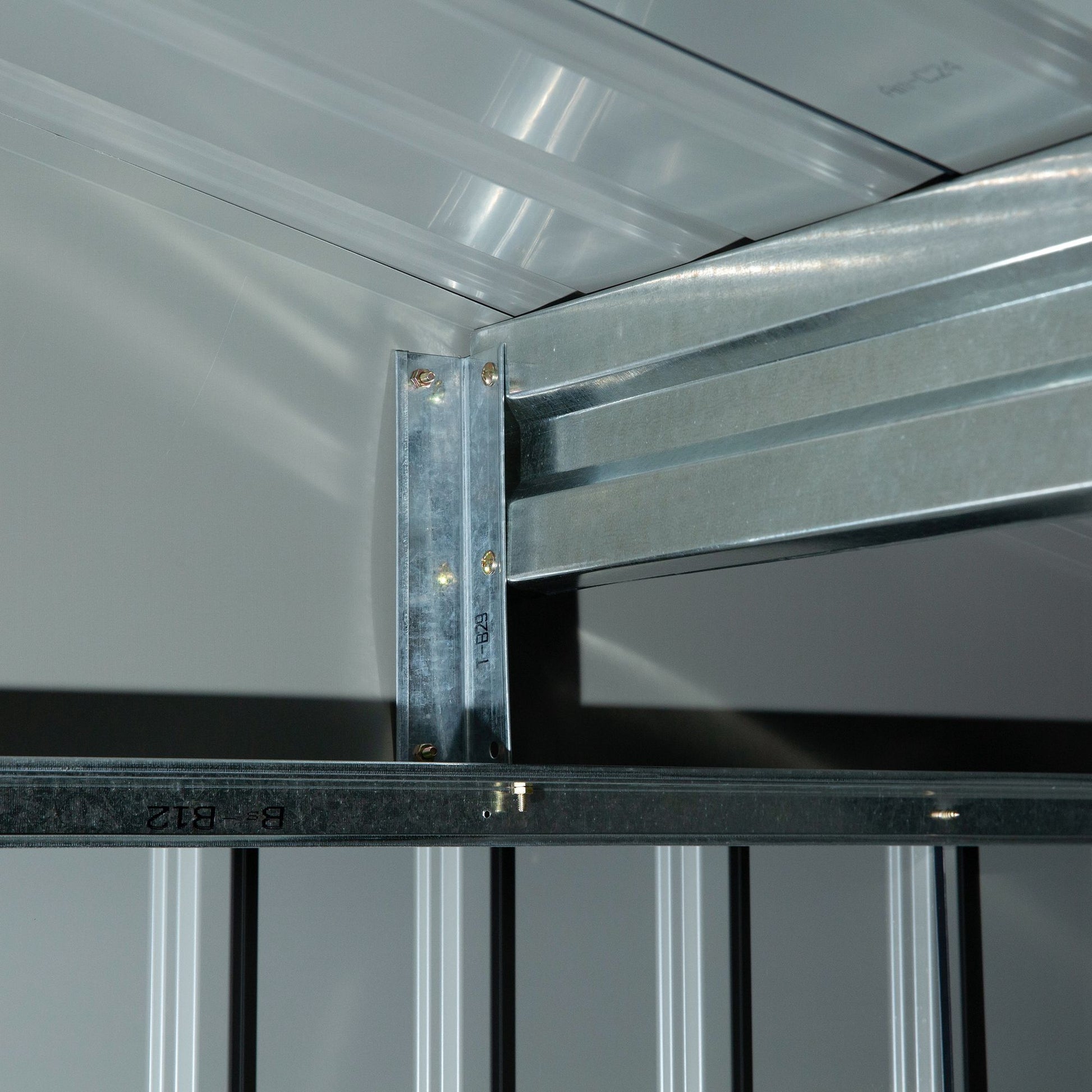 - Sloping roof: Allows water to roll down to the ground, preventing buildup, stagnation and rust damage to this metal shed. Four ventilation slots to allow air inside - helps keep it fresh.