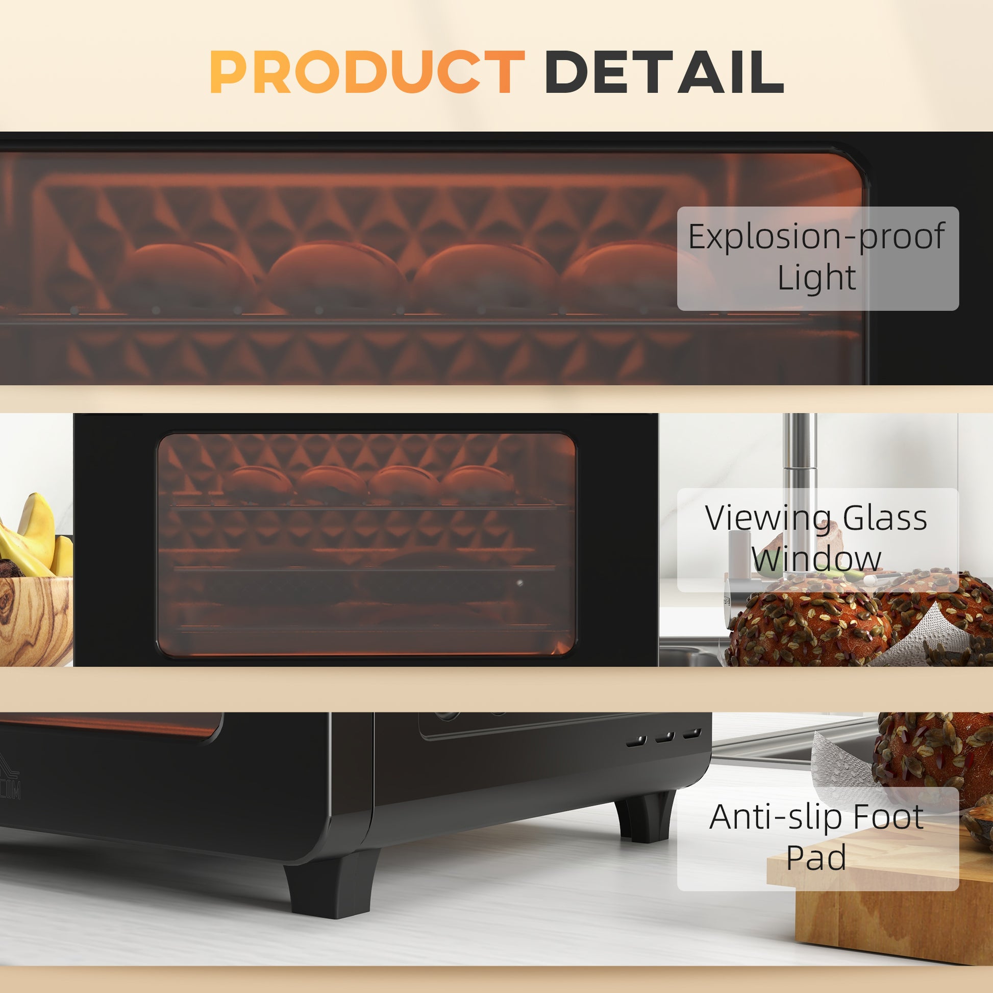 Retro style for the everyday: this convection oven is a piece to love using and having in your home. The black colour, chrome accents and slight boxy shape gives it an old-school look with a modern twist. Adjust the temperature between 40-220℃ easily, the thermistor control enables fast, precise closed-loop temperature control. With 17 presets-toast, defrost, ferment, chicken, wings, steak, fish, pizza, cookies, chips, bread, cake, dehydrate, popcorn, vegetables, keep warm and air fryer.