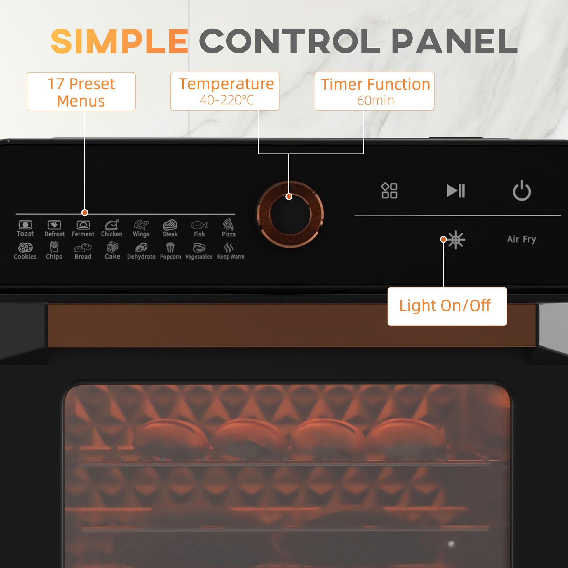 - 40-220℃ temperature, 12h timer with 17 presets: Set the heat and cooking time of the table top oven to your choice. With 17 presets-toast, defrost, ferment, chicken, wings, steak, fish, pizza, cookies, chips, bread, cake, dehydrate, popcorn, vegetables, keep warm and air fryer.