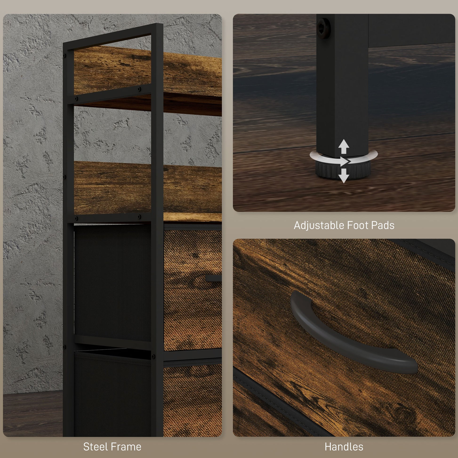 A spacious and simple approach to clothes storage, with this chest of drawers. It comes in industrial and rustic wood-effect design, a minimal and versatile look: it's great for plenty of different interior styles. This dresser comes with seven drawers for storing and organising various garments. A powder coated steel frame for a strong core, finished with adjustable feet for balance.Specifications