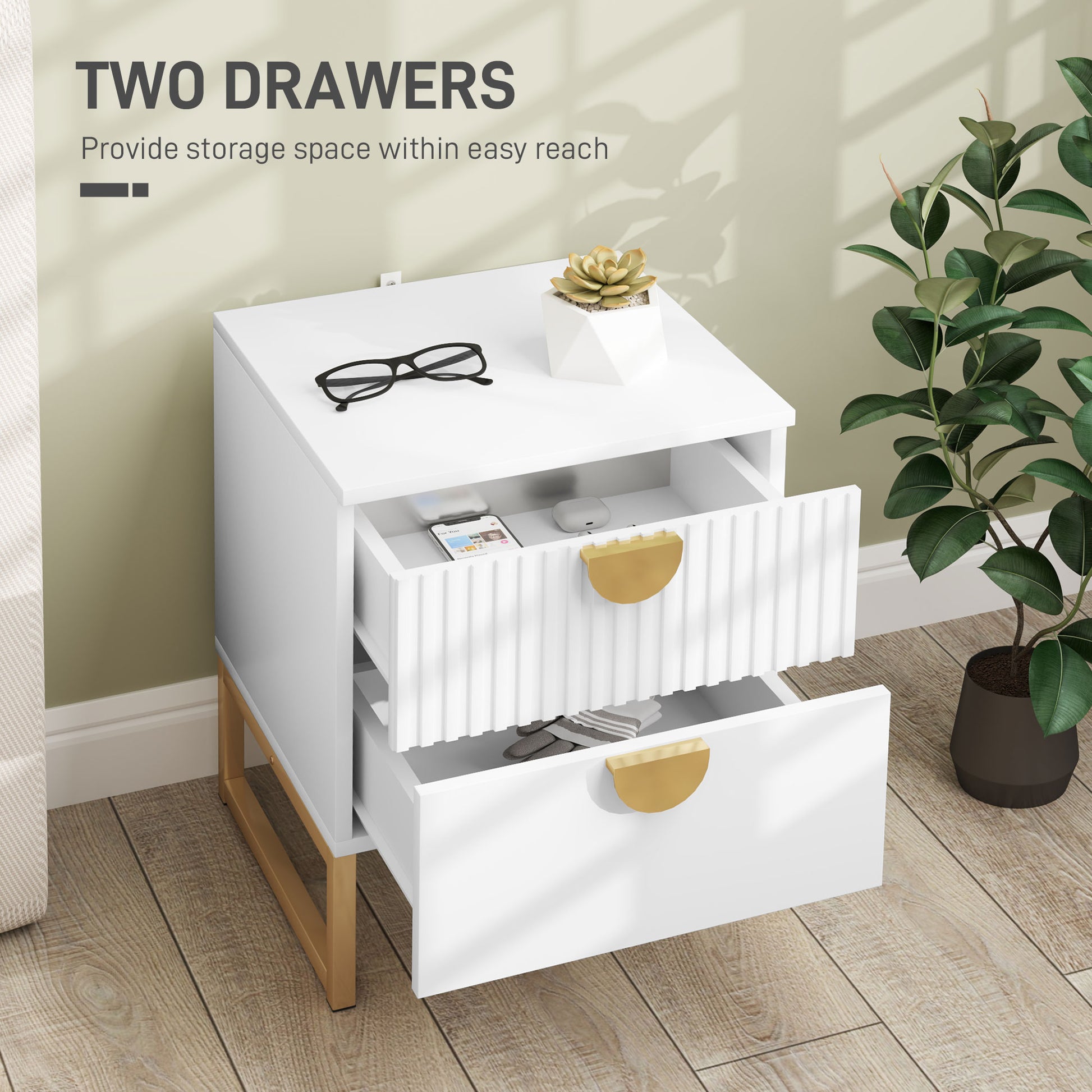A bedroom essential, in bold and elegant style with this nightstand. The top ridged drawer front and gold coloured handles add a beautiful touch to the solid colour. With two drawers and a flat tabletop, there's lots of storage for bedtime essentials and more. Complete with a metal base for strong support.Specifications