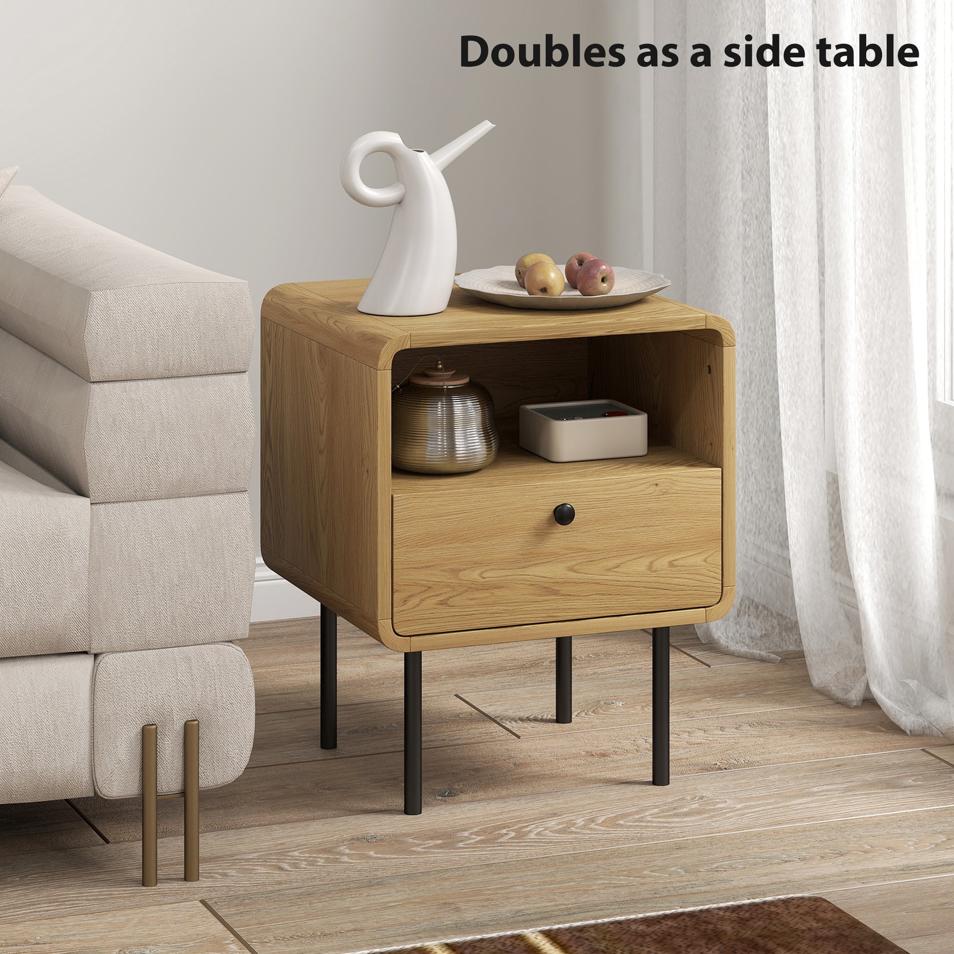 Tired of a cluttered bedside and the anxiety of wobbly furniture? A messy, unstable space disrupts your peace. This bedside table offers a tranquil solution. Its rounded corners ensure safety in the dark, while combined open and drawer storage organizes your essentials. Built with a strong frame, this reliable bedside cabinet provides a stable, serene foundation for your nightly retreat, transforming your bedroom into a truly restful sanctuary.Specifications