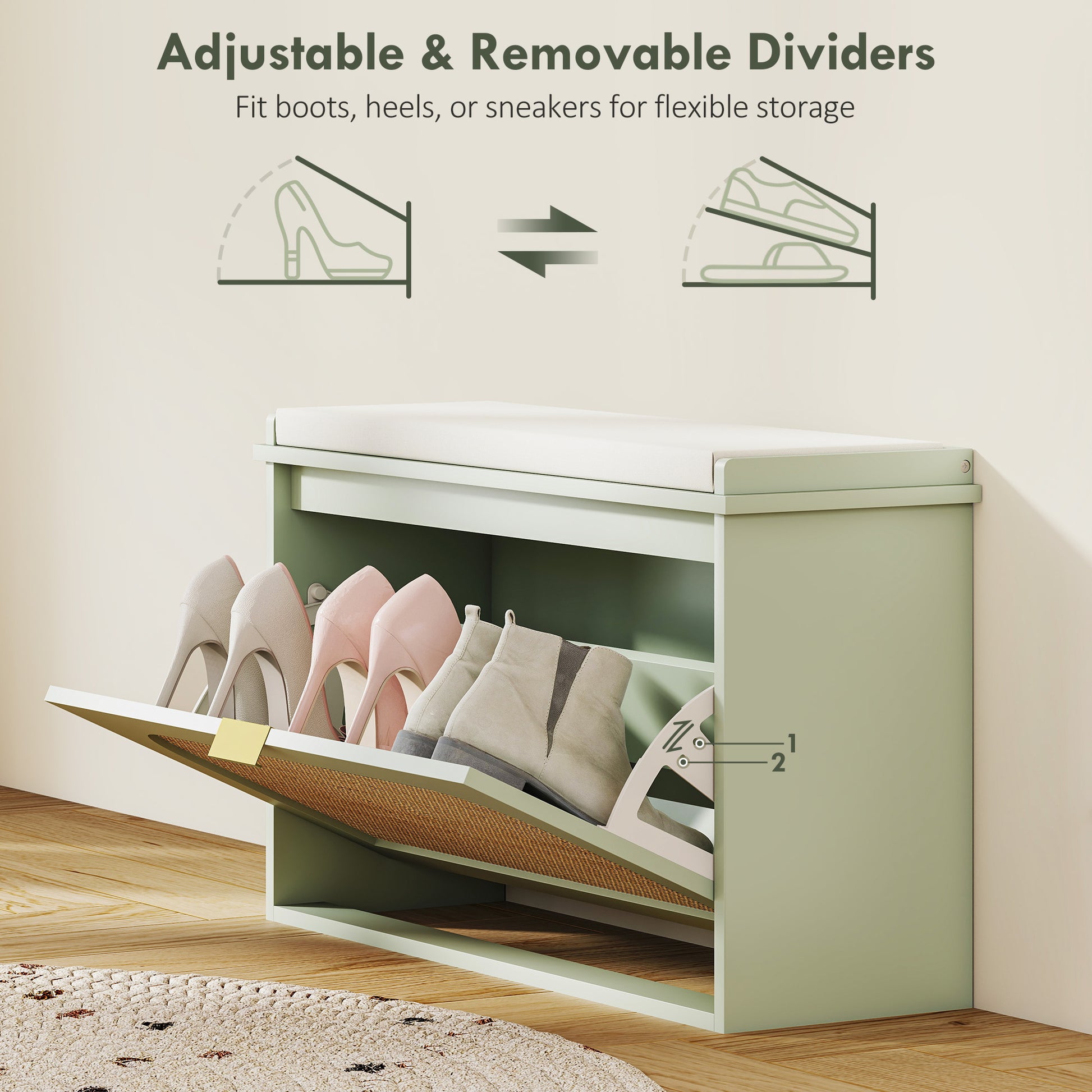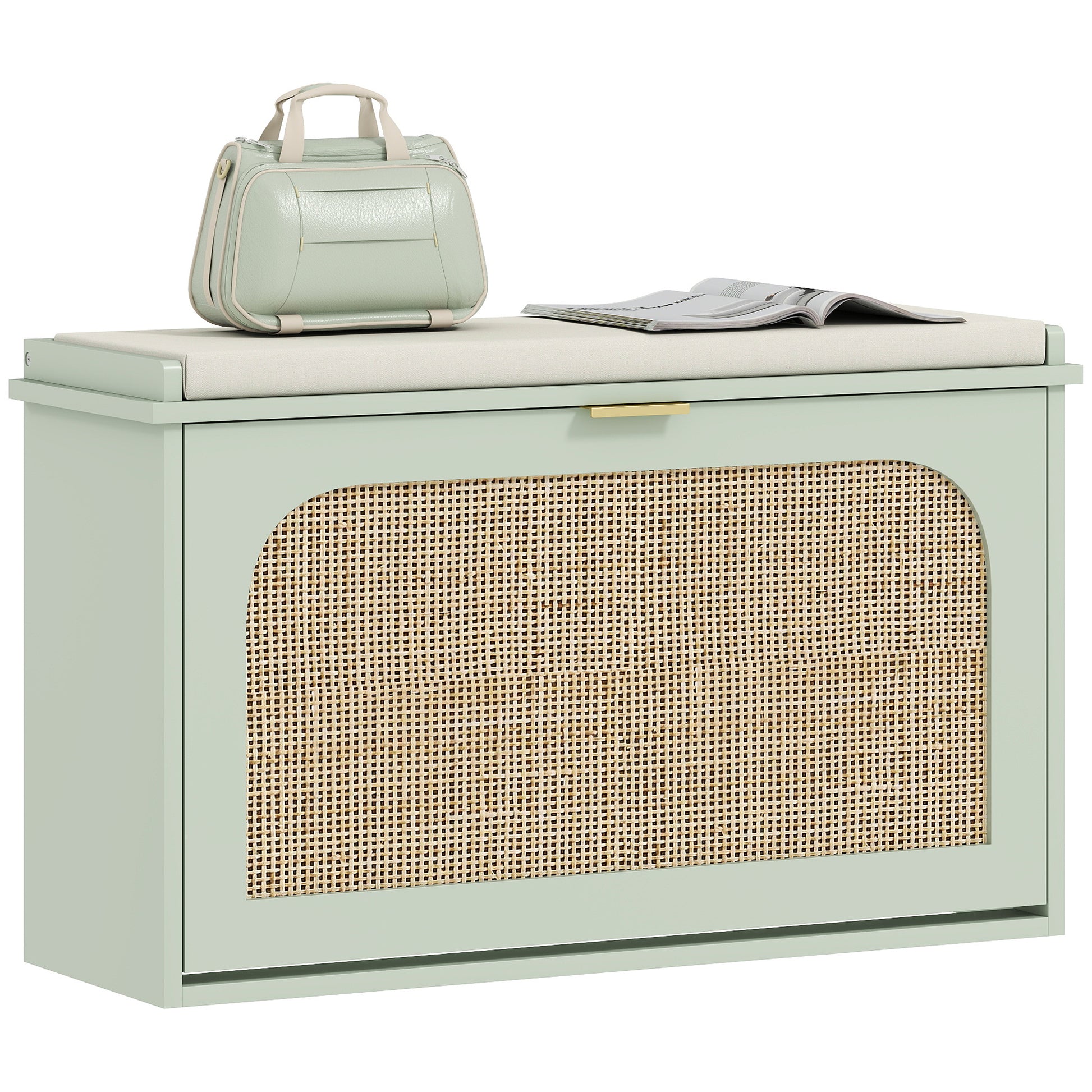 Boho Shoe Bench with Padded Seat and Flip-Drawer, Light Green