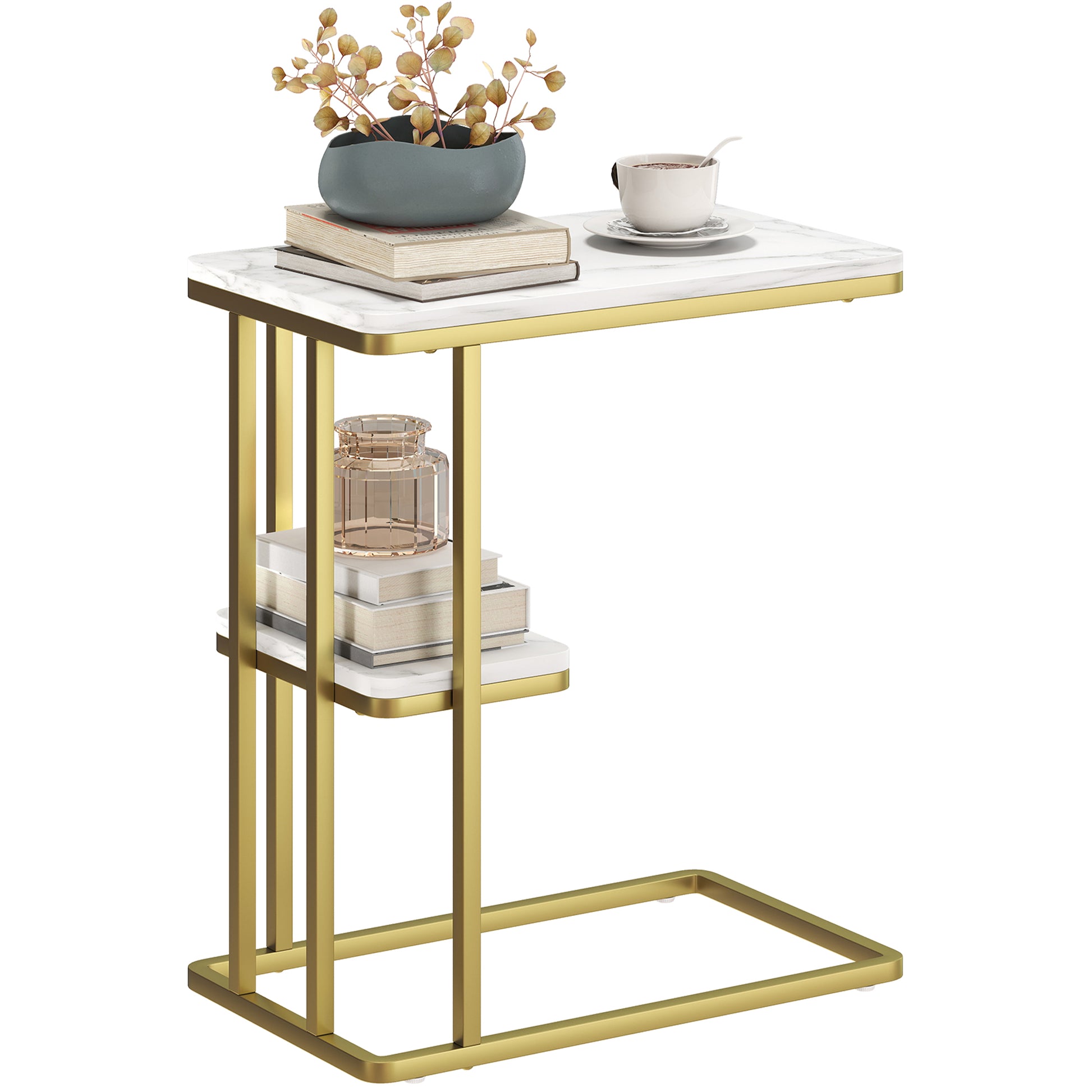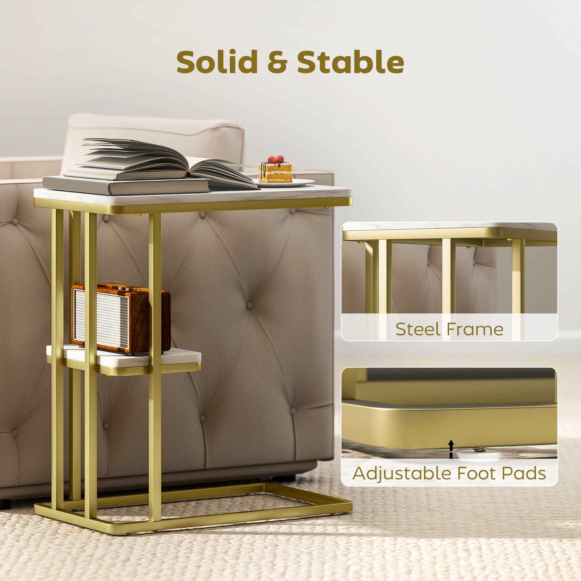 Discover the chic convenience of the side table! Unique C-shape makes this end table slide effortlessly under sofas or beds, bringing your essentials close—great for cosy nights or productive days. Enjoy clutter-free living with its 2-tier storage, excellent for tucking away books and snacks, all while adding a touch of elegance with its white marble-effect top and gold-tone frame.Specifications
