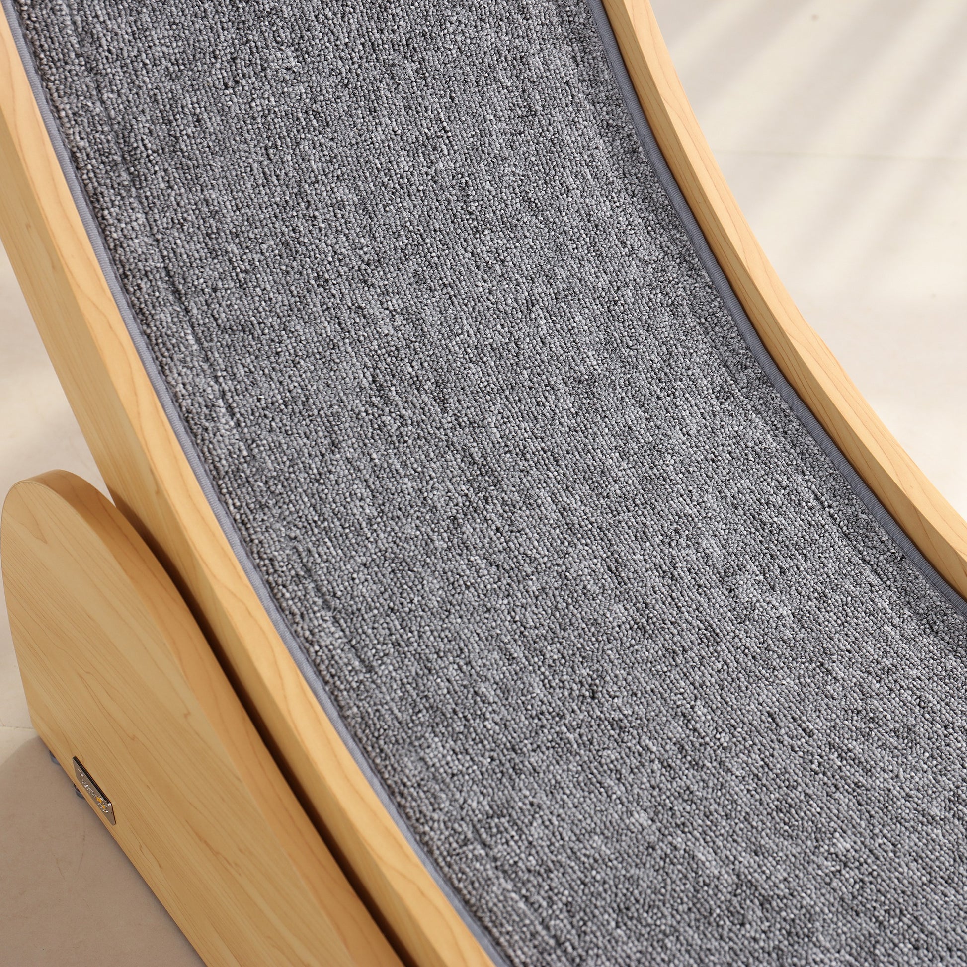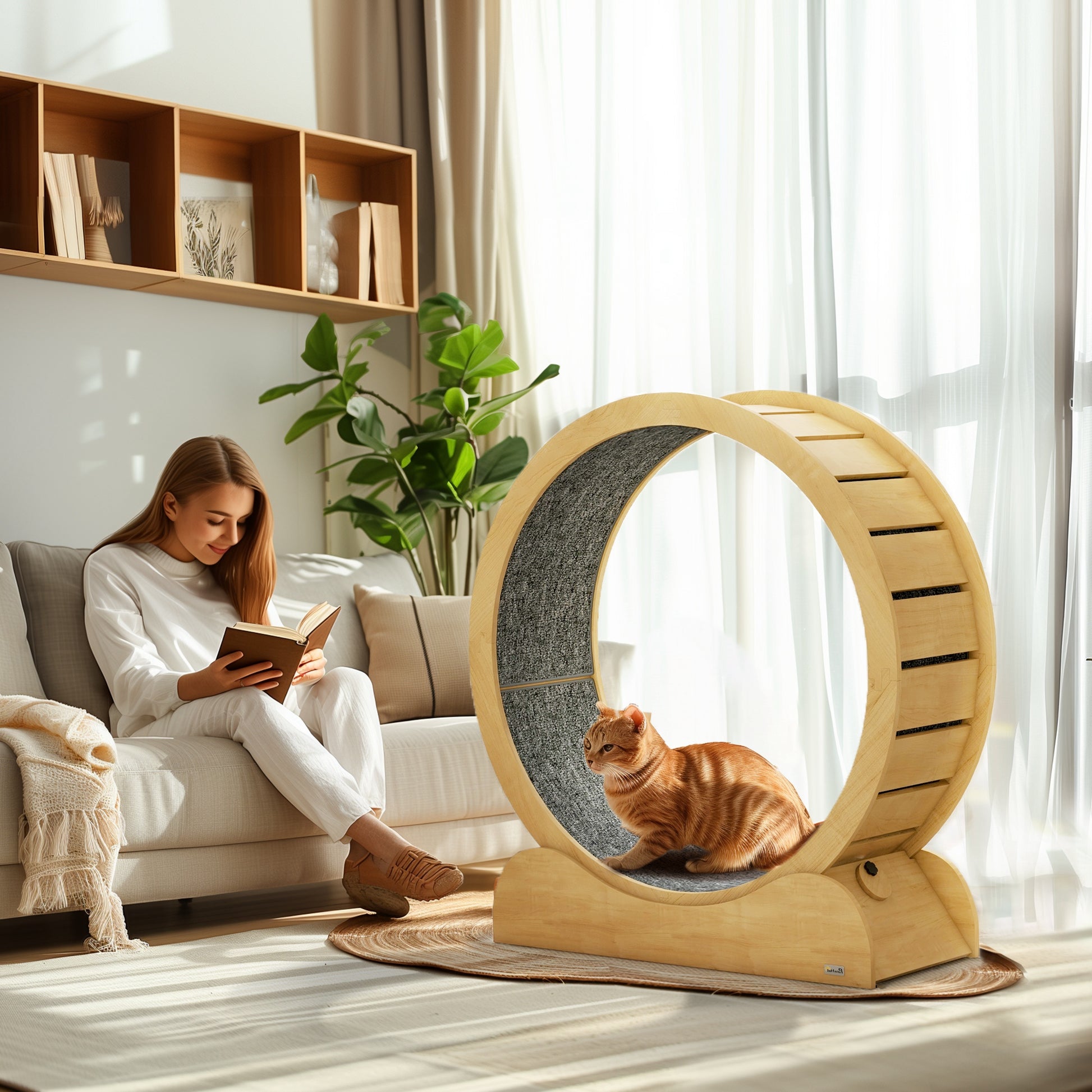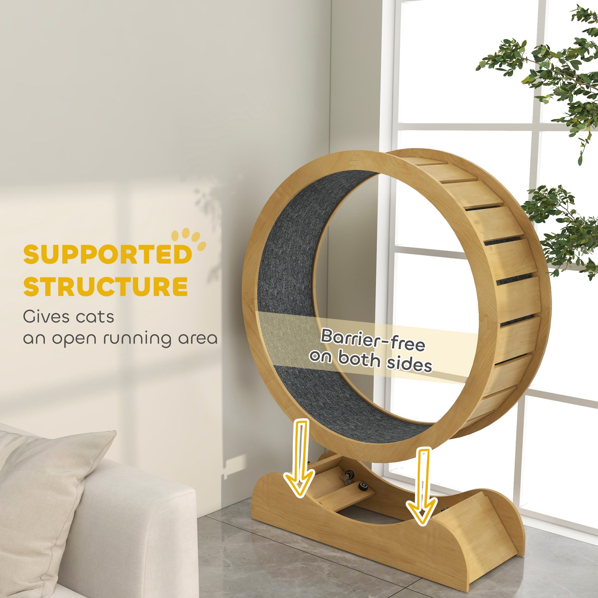 Even at home, cats can stay active and heathy, thanks to this cat exercise wheel. The inside is covered with a cloth-like material – it's soft on their paws, keeping them comfortable when running. There's a brake on the base to stop the running wheel when needed – and when they're feeling active again, just turn it back on. A natural wood grain piece, its minimalistic appearance blends nicely with any decoration. Perfect for house cats, they can exercise at home.Specifications