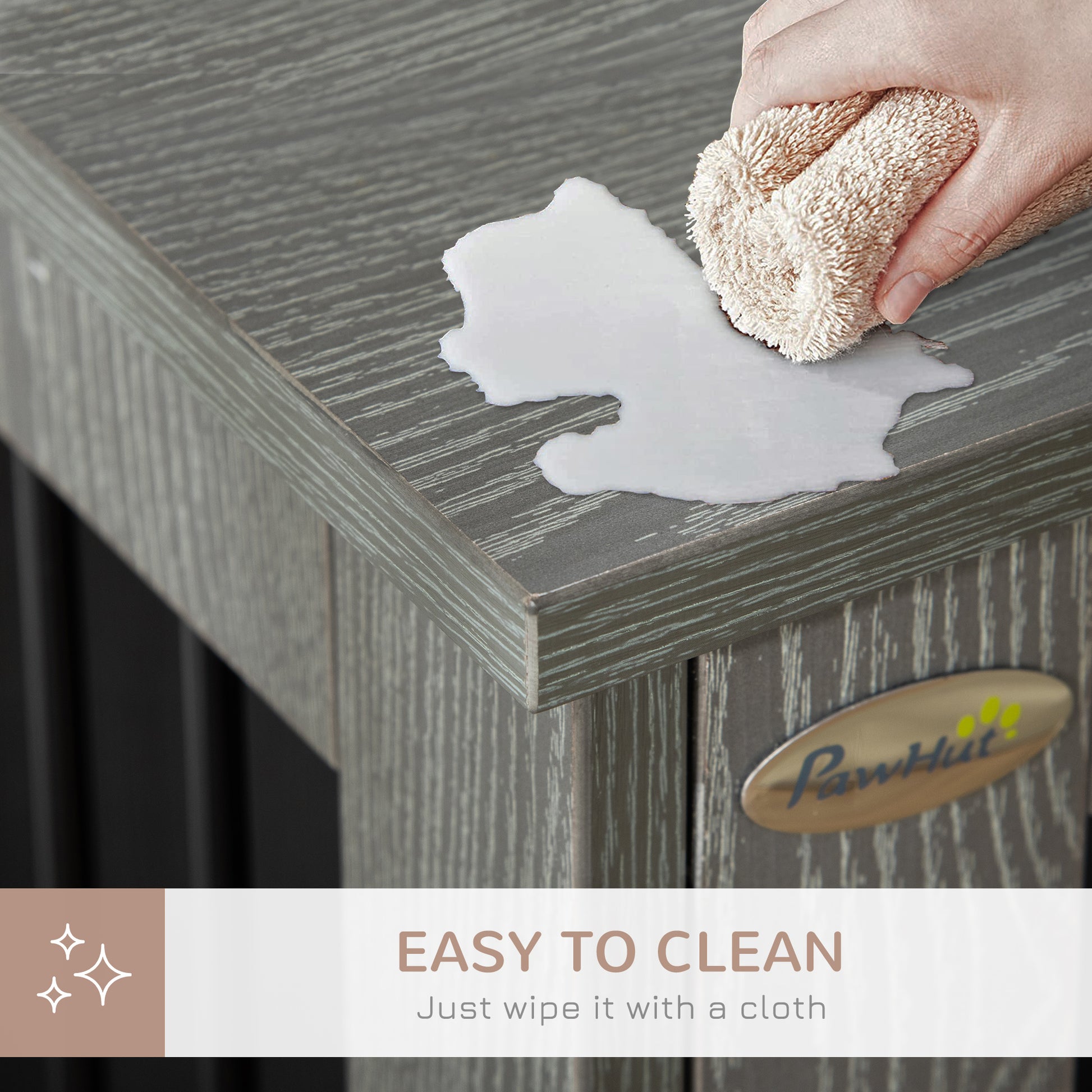 This stylish dog cage, fused with a side table, is designed to keep pets safe, whilst the top is for displaying pieces or storing pet supplies. Steel bars on the windows for ventilation, whilst the raised floor stops damp and moisture seeping through, giving dogs a comfortable space to relax in. They'll remain securely inside, thanks to the magnetic door with latches – you can leave them alone without worrying. It's a modern dog crate, keeping pets protected and adding to existing décor.