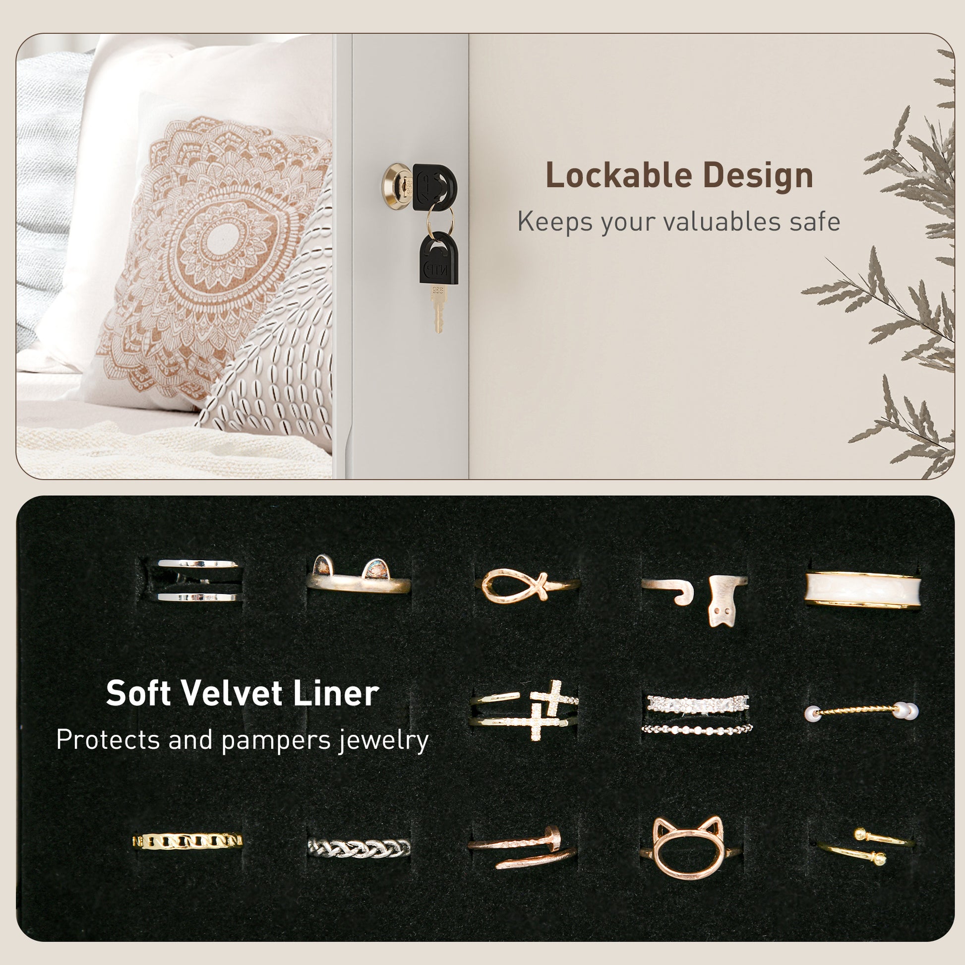 Something for every bedroom - this jewellery storage mirror. Keep all your jewellery, make-up and perfume together with the 80x earrings slots, 90x stud holes, 24x necklace hooks, 78x ring slots, three bracelet rods, lipstick/make-up tool boxes, storage bags, shelves and drawers. All is secured and protected with the lockable magnetic door. Complete with a front full body mirror to see yourself fully before leaving the house.Specifications