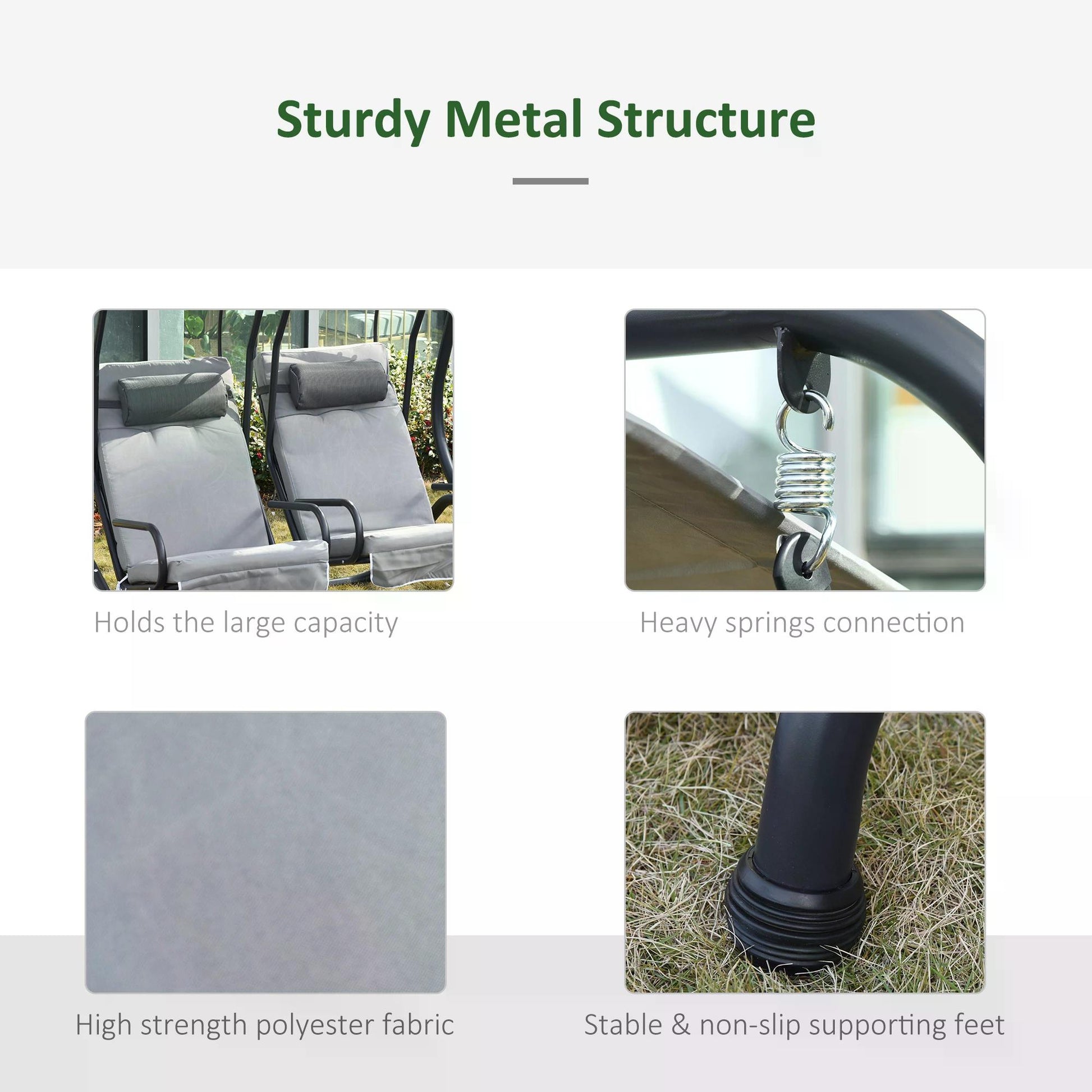 - STEEL FRAME: Large and balanced base to keep this garden swing chair steady even when you're rocking. Foot pads for swing bench's extra stability.