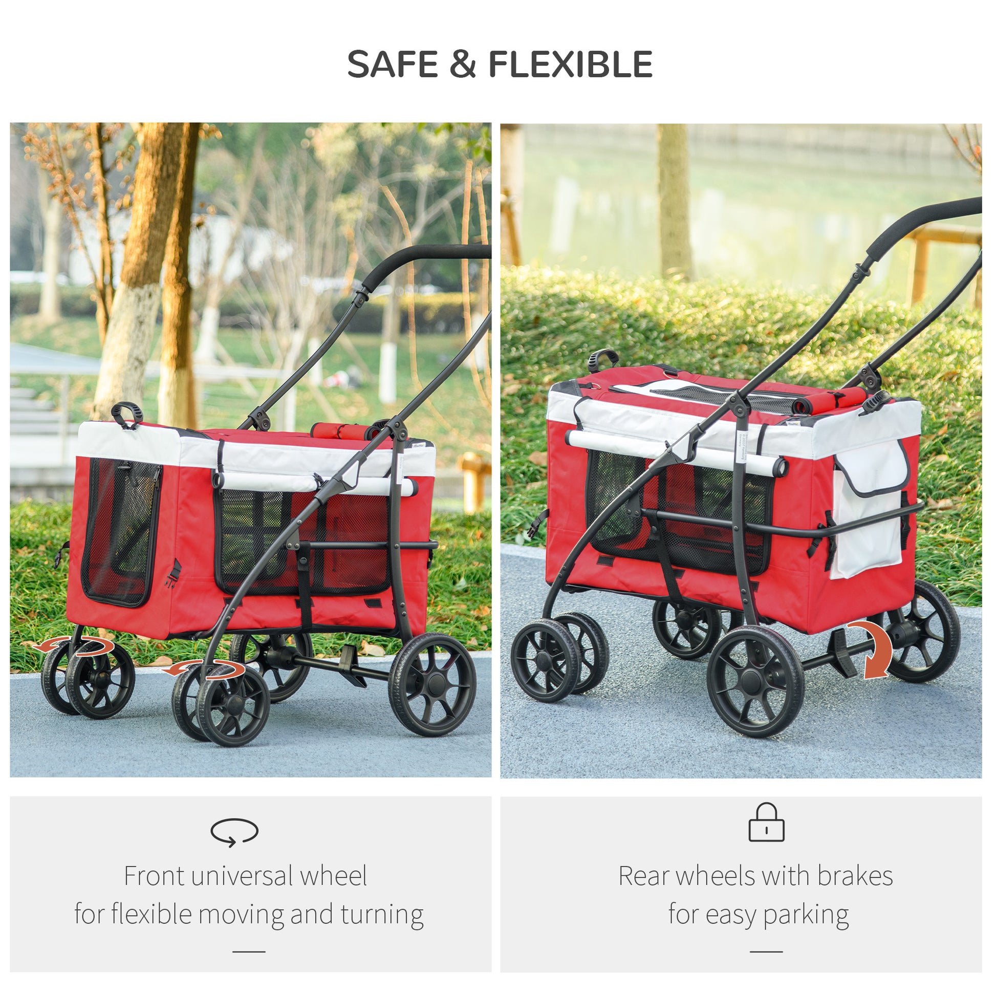 - Safe material: The dog buggy has front universal EVA wheels, so it pushes smoothly, whilst the rear directional wheels include brakes to keep it in place when needed. Two safety leashes keep pets securely strapped in.