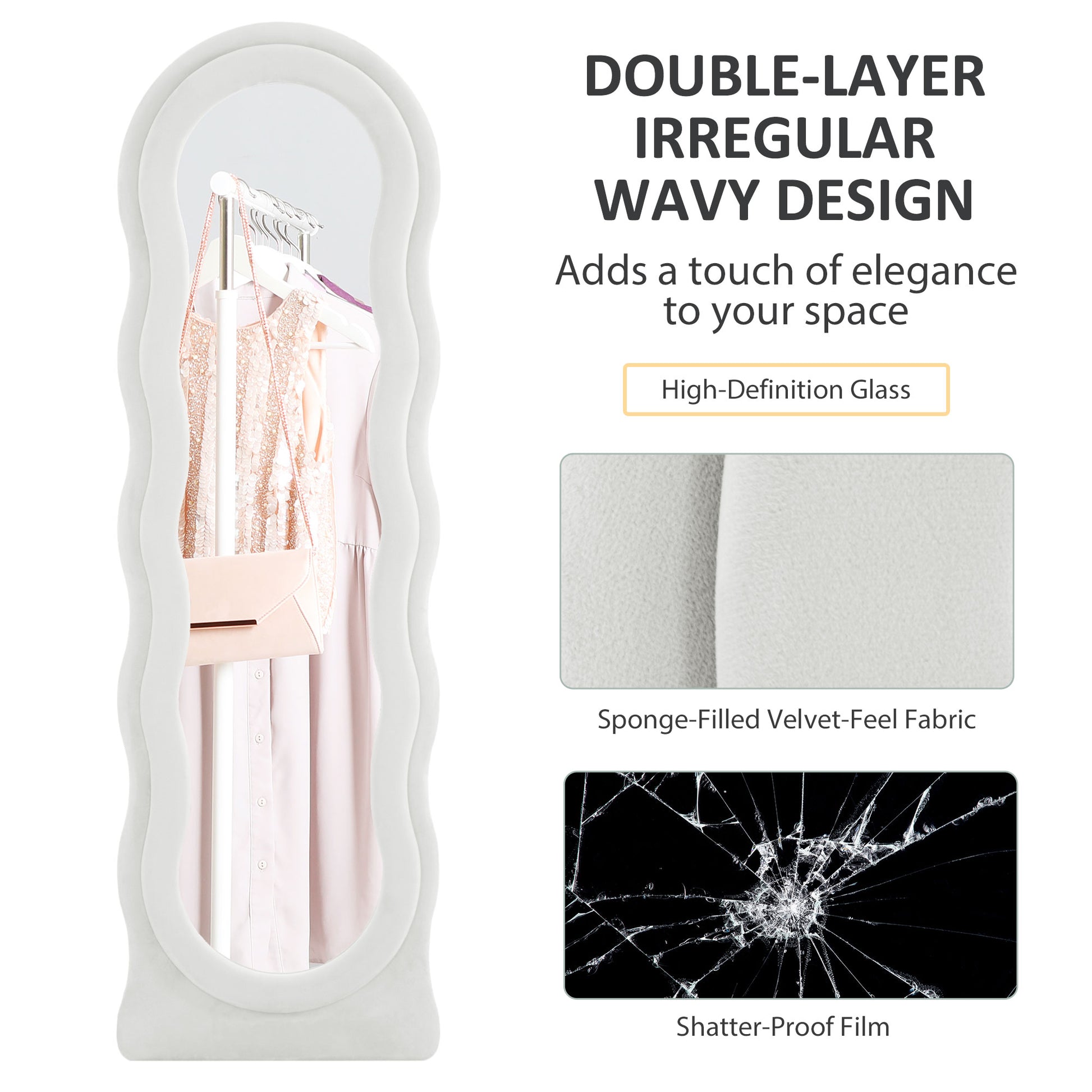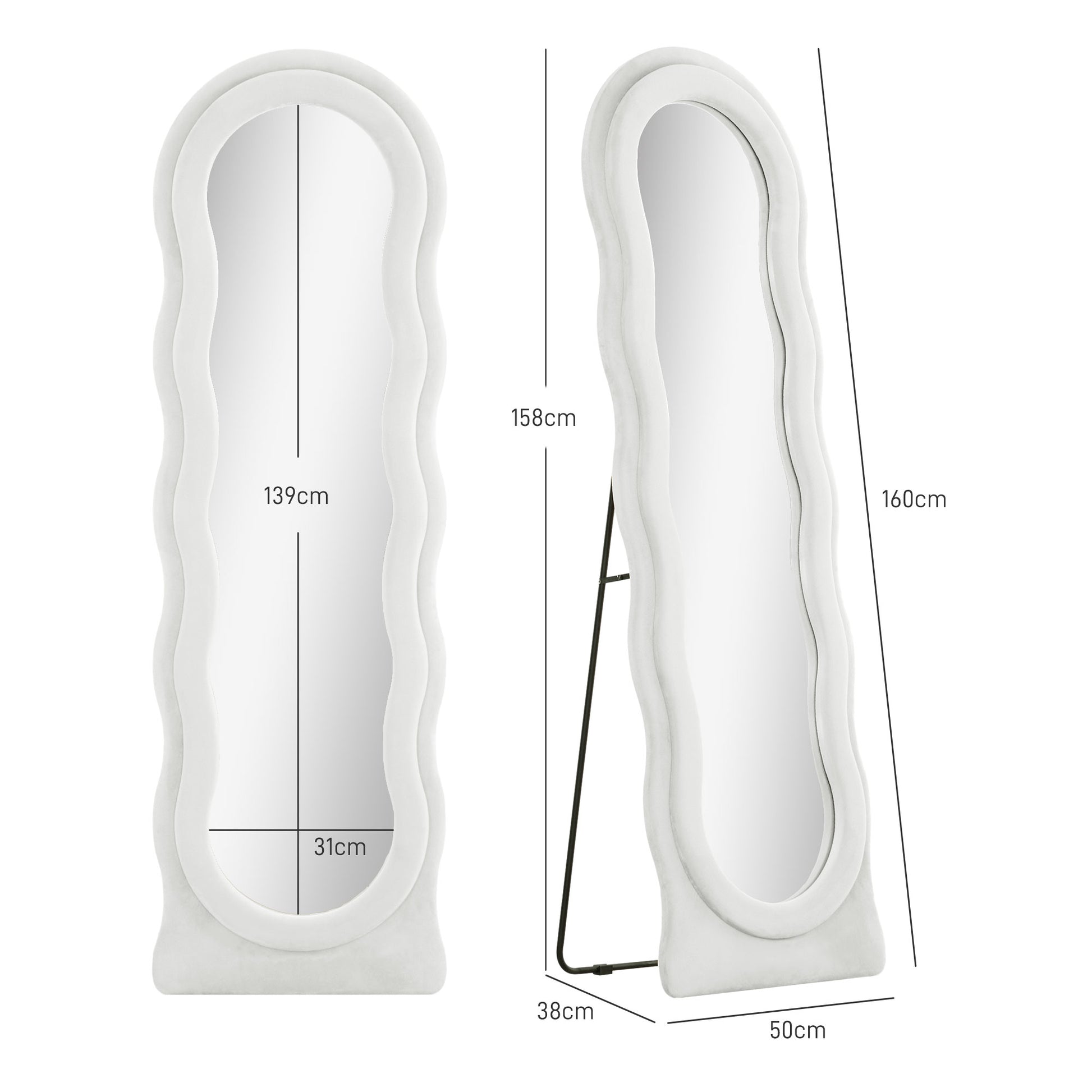 Fun and funky, this wavy mirror creates a statement in your home and beyond. The wavy shape, block colour and velvet-feel finish of the frame all work together to give it a bold, retro looklet the standing mirror work alongside your furniture, or give it a place which allows it stand out and command attention forever more. Thanks to the full length and thick glass, you can see yourself fully and clearly: you'll be leaving your home confidently forever more.