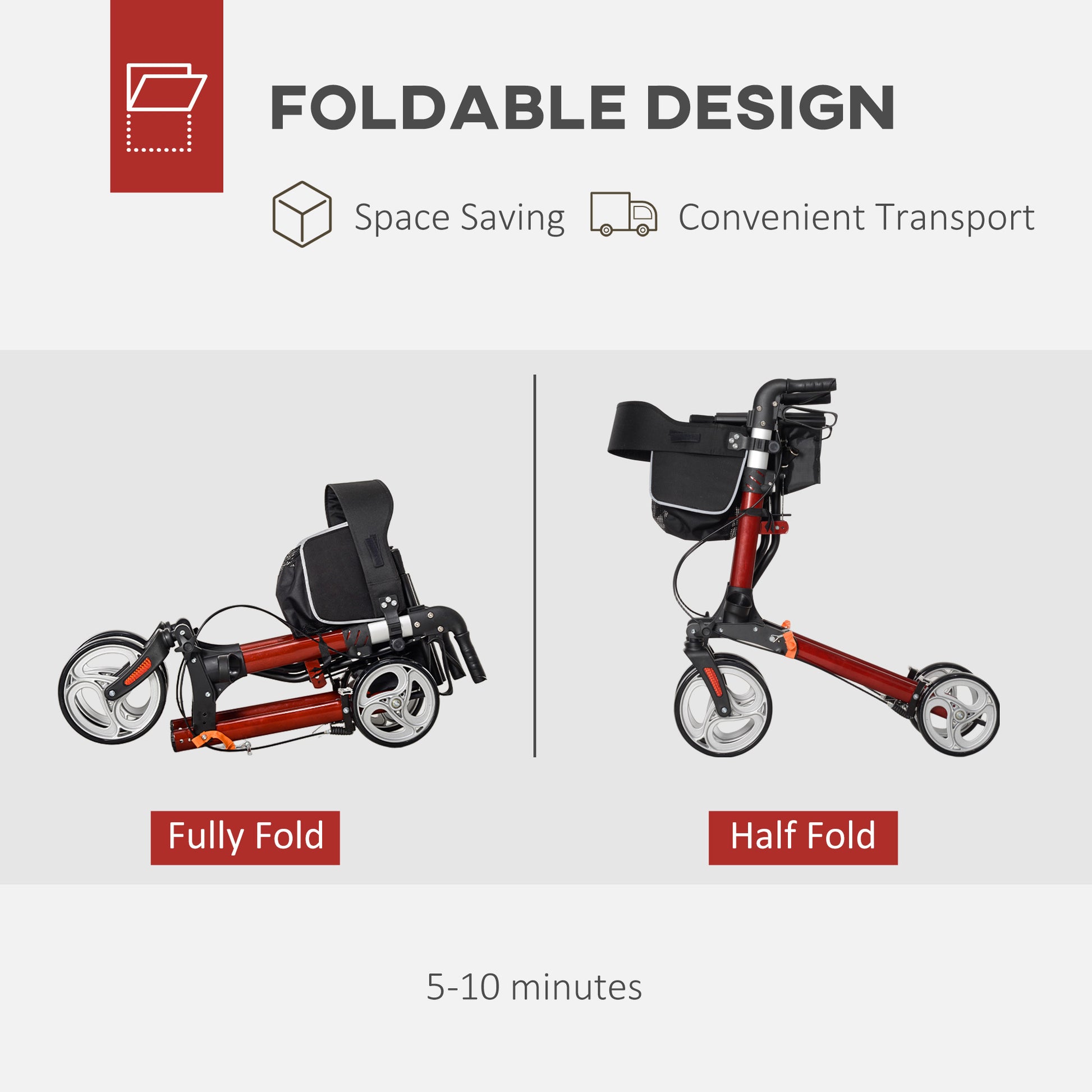 Fully Folding Rollator Walker with Seat, Backrest, Bag, Red