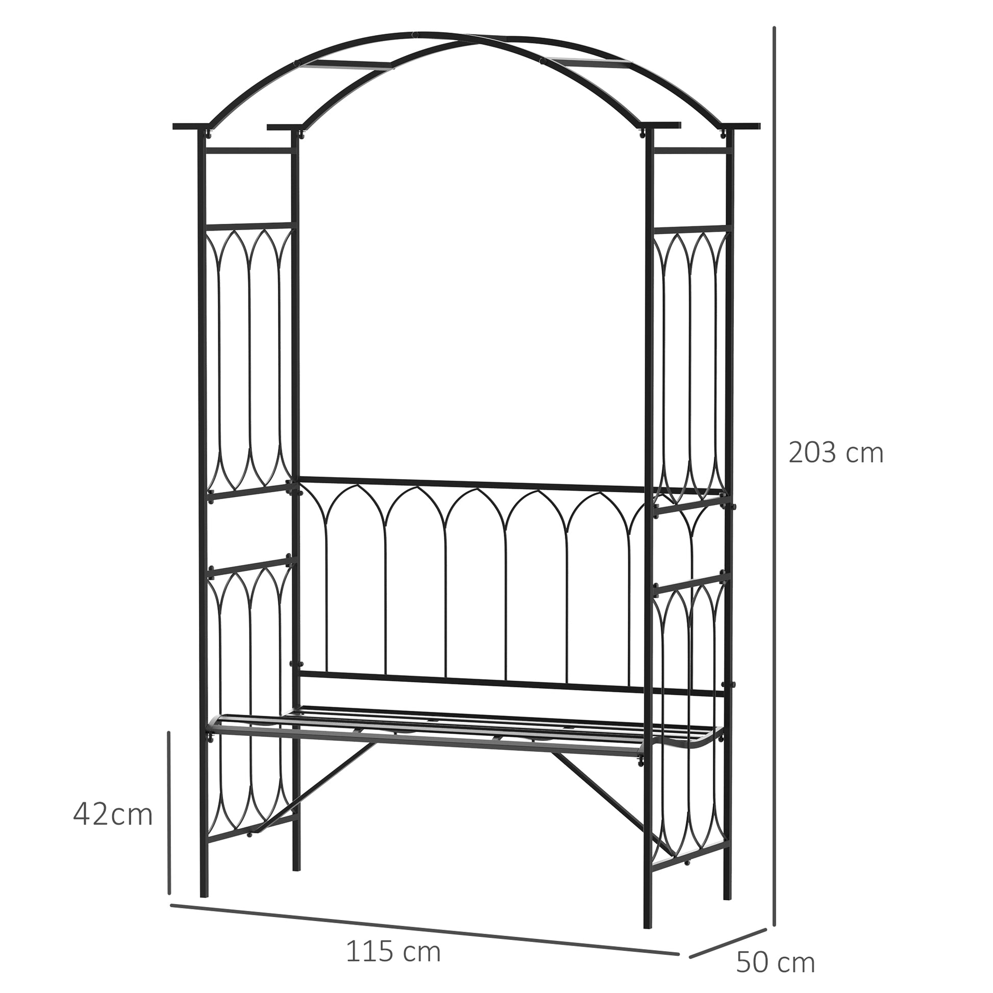 Garden Metal Arch Bench Outdoor 2-Seater Chair, Patio Rose Trellis Arbour Pergola for Climbing Plant Vintage Classic Black 115x50x203H cm