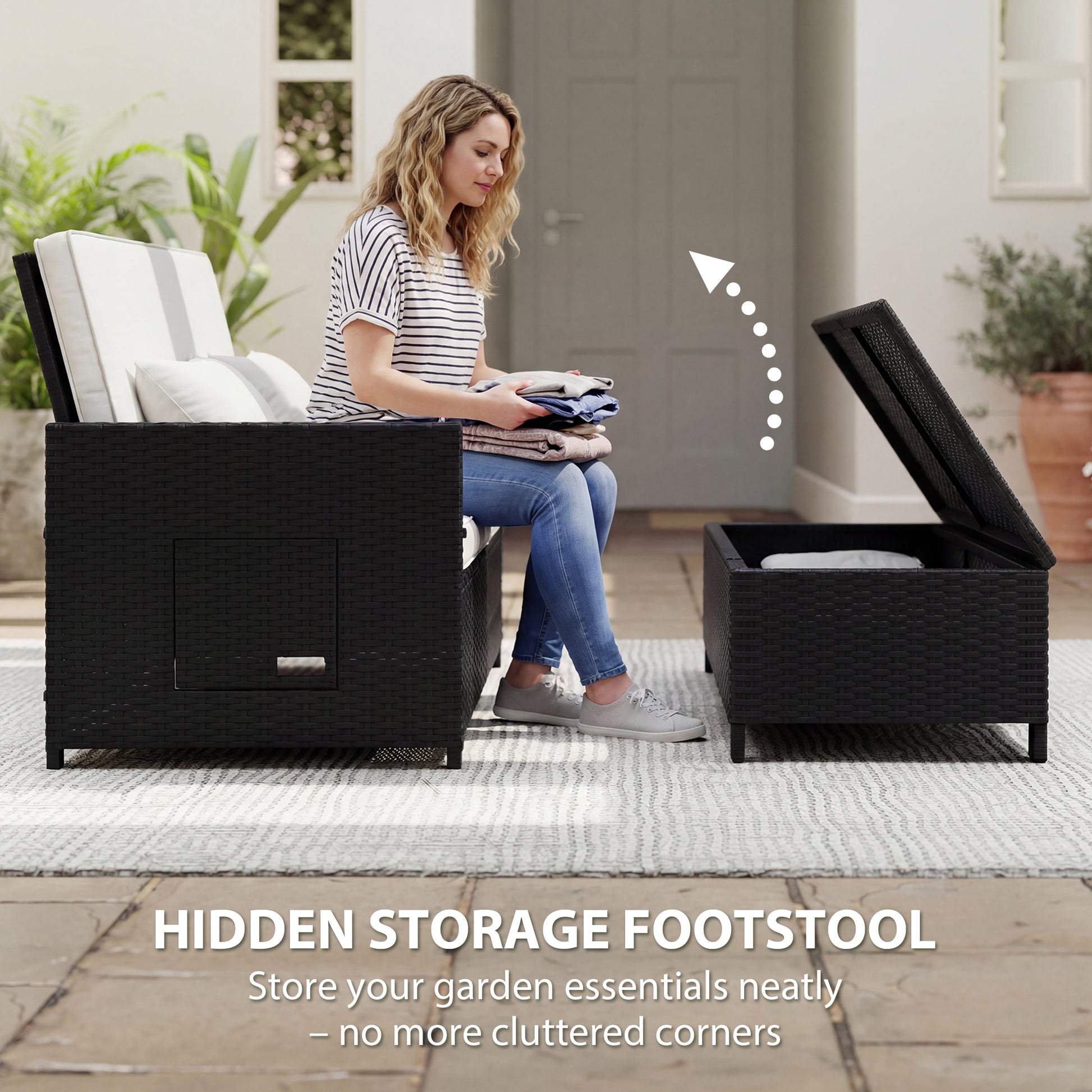 A two-piece garden day bed which can be used together or separately: lie or sit in the sun with this rattan lounger . The back on the sofa is adjustable to different positions. The footstool has storage to keep smaller pieces in a safe place. Both pieces come with padded cushions, with extra pillows, for comfort. Metal frame for a strong core, wrapped in PE wicker for extra durability. This outdoor daybed is complete with hinged sides which act as a side table.Specifications