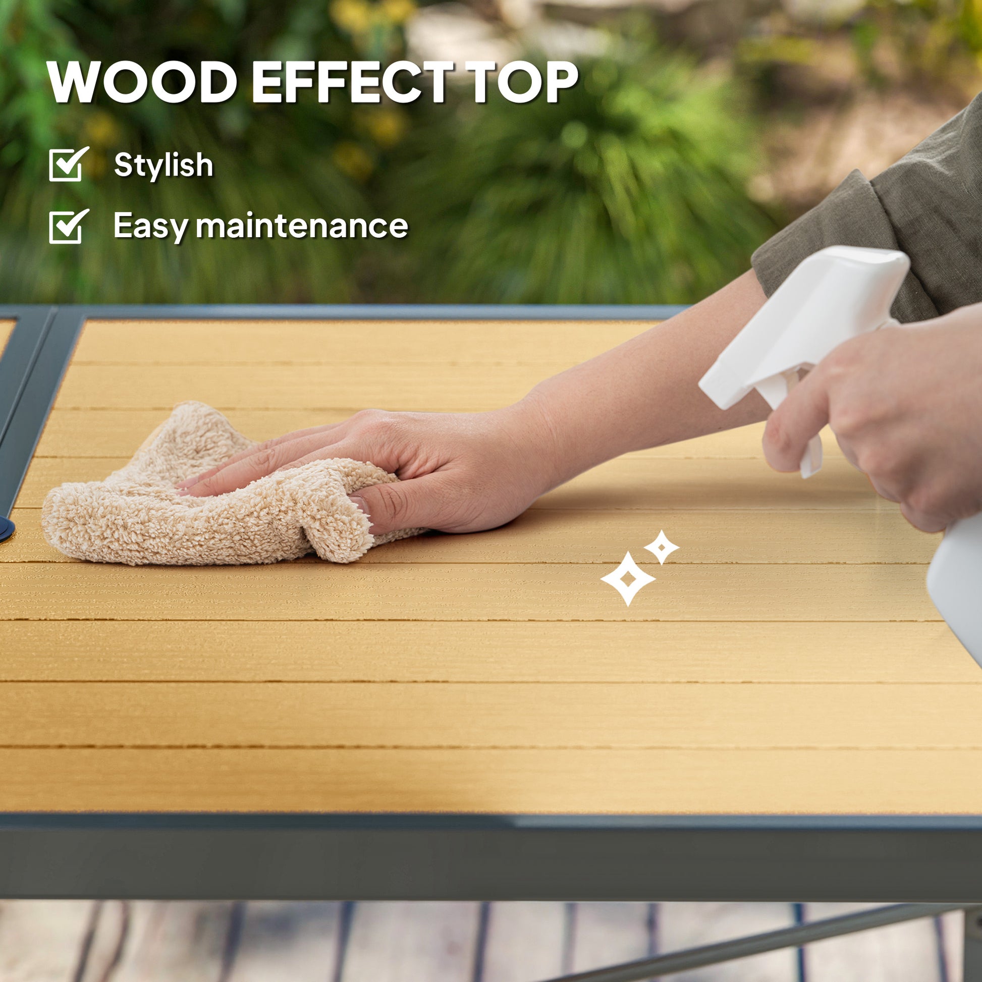Discover the charm of al fresco dining with the Outsunny garden dining table, designed to seat six comfortably. Featuring a wood-effect galvanised steel top and a robust steel frame with a powder-coated finish, this outdoor table ensures style and stability. It's also equipped with an umbrella hole, suitable for sunny or rainy days in your garden or patio.Specifications