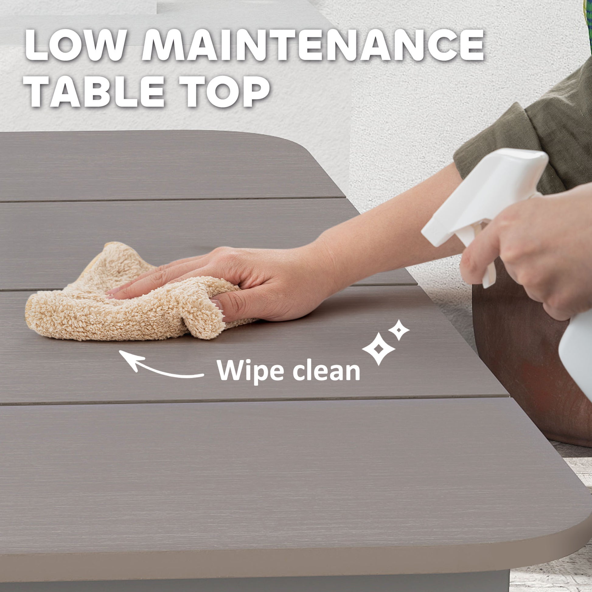 Gather round this Outsunny garden dining table, designed to seat six comfortably. Featuring a robust metal frame with a sleek powder-coated finish and crafted from wood plastic composite, it's not only weather-resistant but also a breeze to clean. Its modern minimalist style effortlessly enhances any garden setting, making it your go-to for outdoor gatherings.Specifications