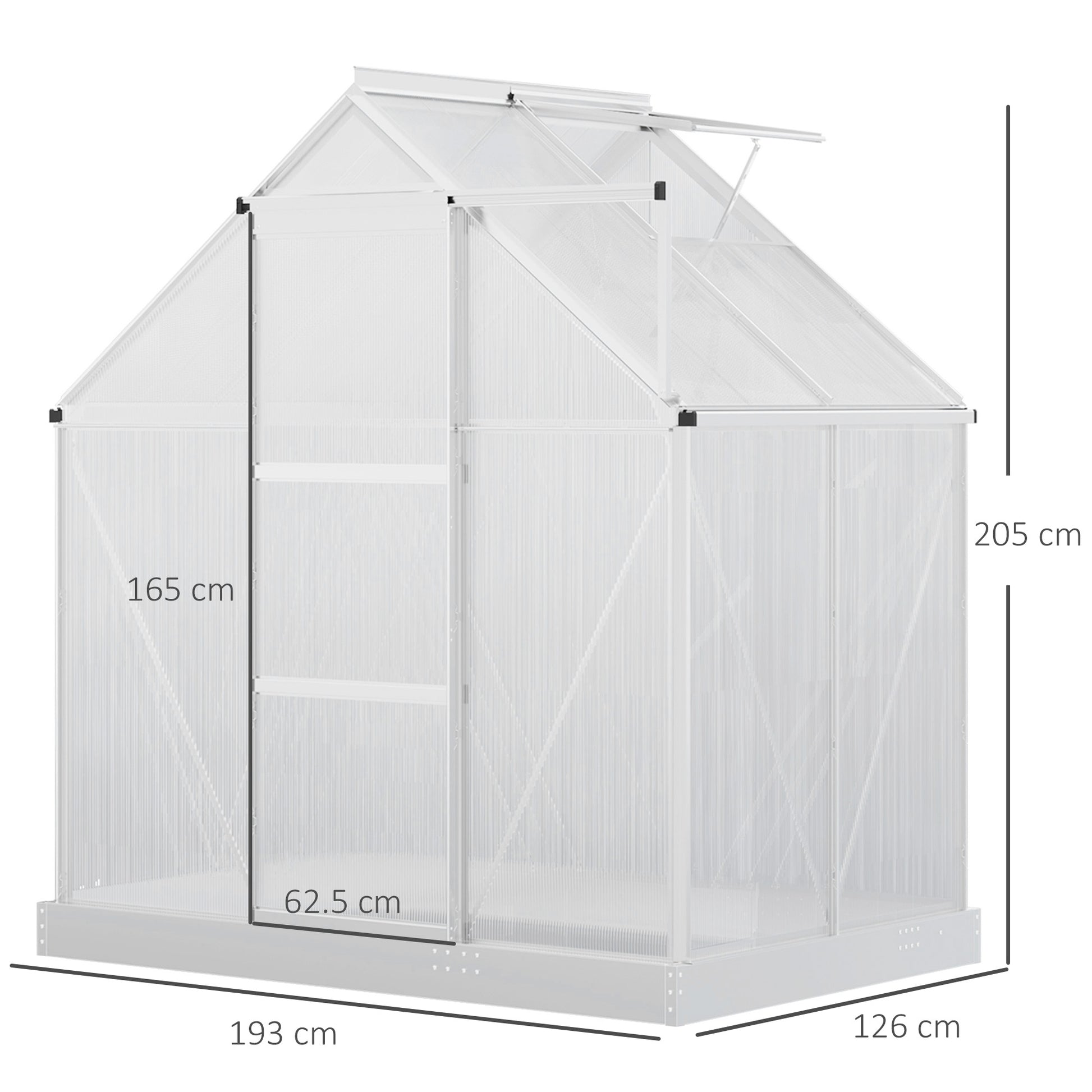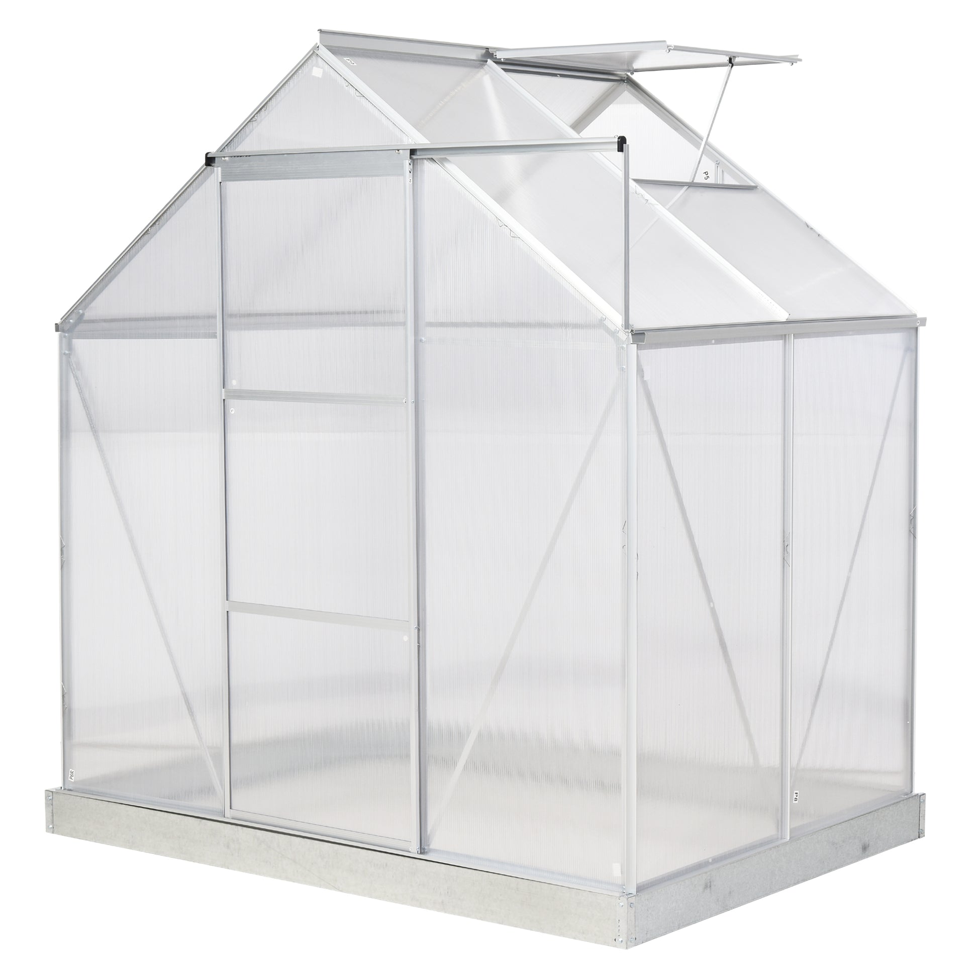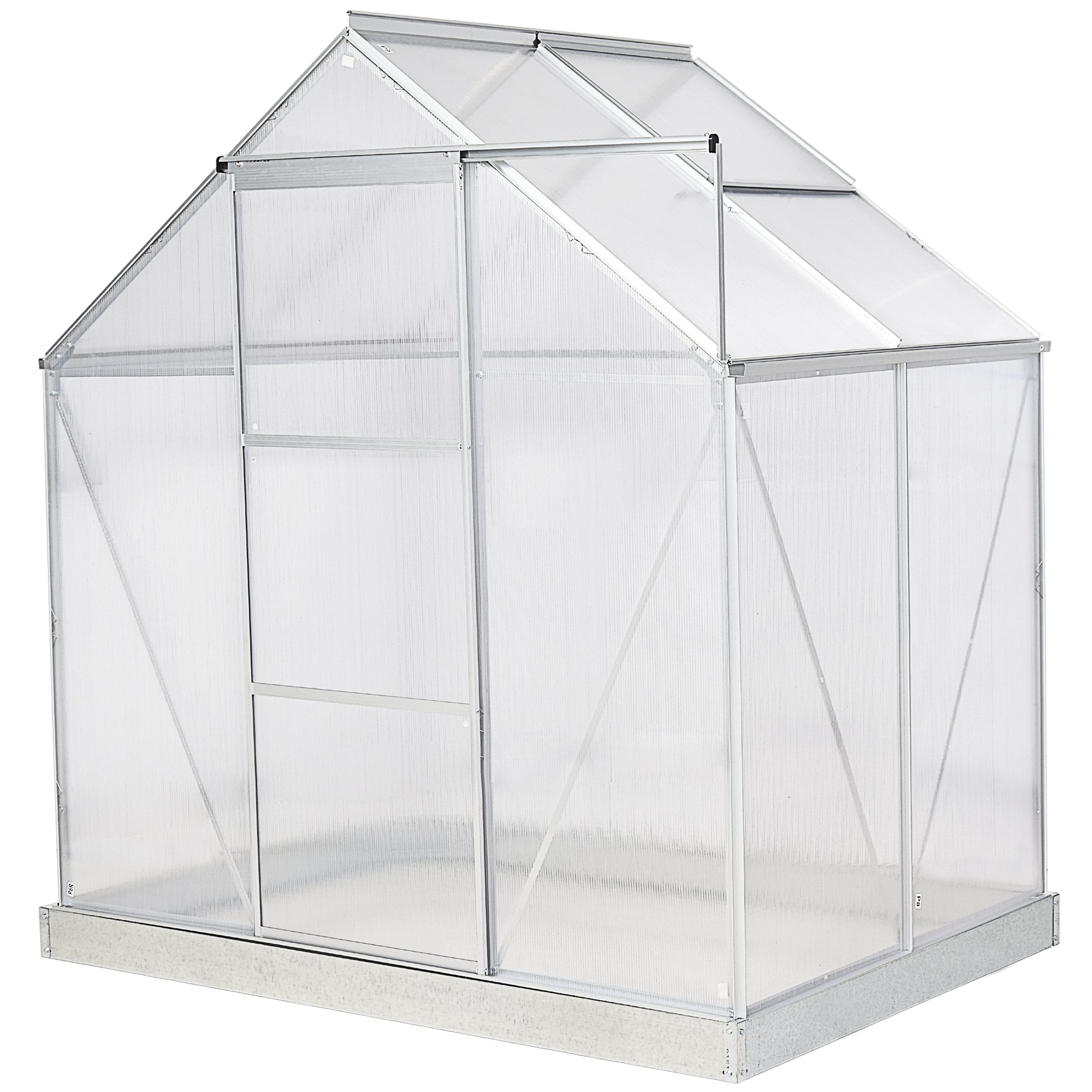 Let your plants grow heartily with this outdoor greenhouse from Outsunny. Inner area provides plenty of growing room, with an aluminium frame keeping the structure upright and in place, surrounded with durable polycarbonate panels, which protects from rain and harsh sunlight. A sliding front door provides easy access, with a small window for ventilation inside when needed. Galvanised steel base for extra strength.
