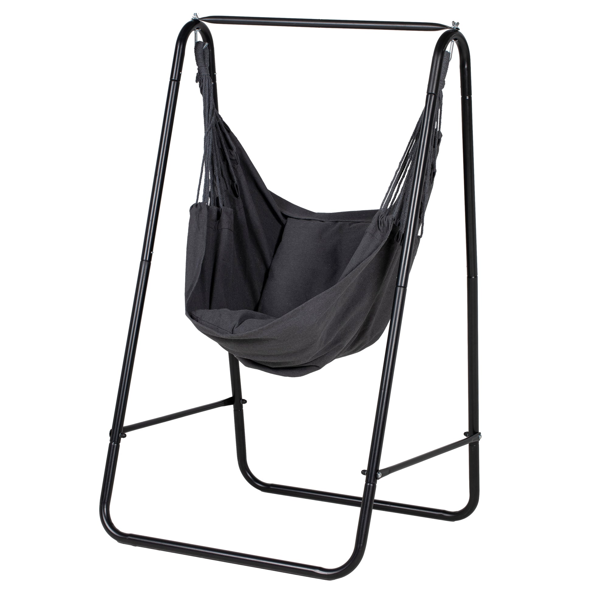 Relax in your own garden with this garden hammock chair. A solid metal frame for a strong, supportive core - the cotton hammock seat hugs you in comfortably. The A shape of the chair curves with your body for maximum comfort. Soft padded cushion is soft. Quick and easy to set up.