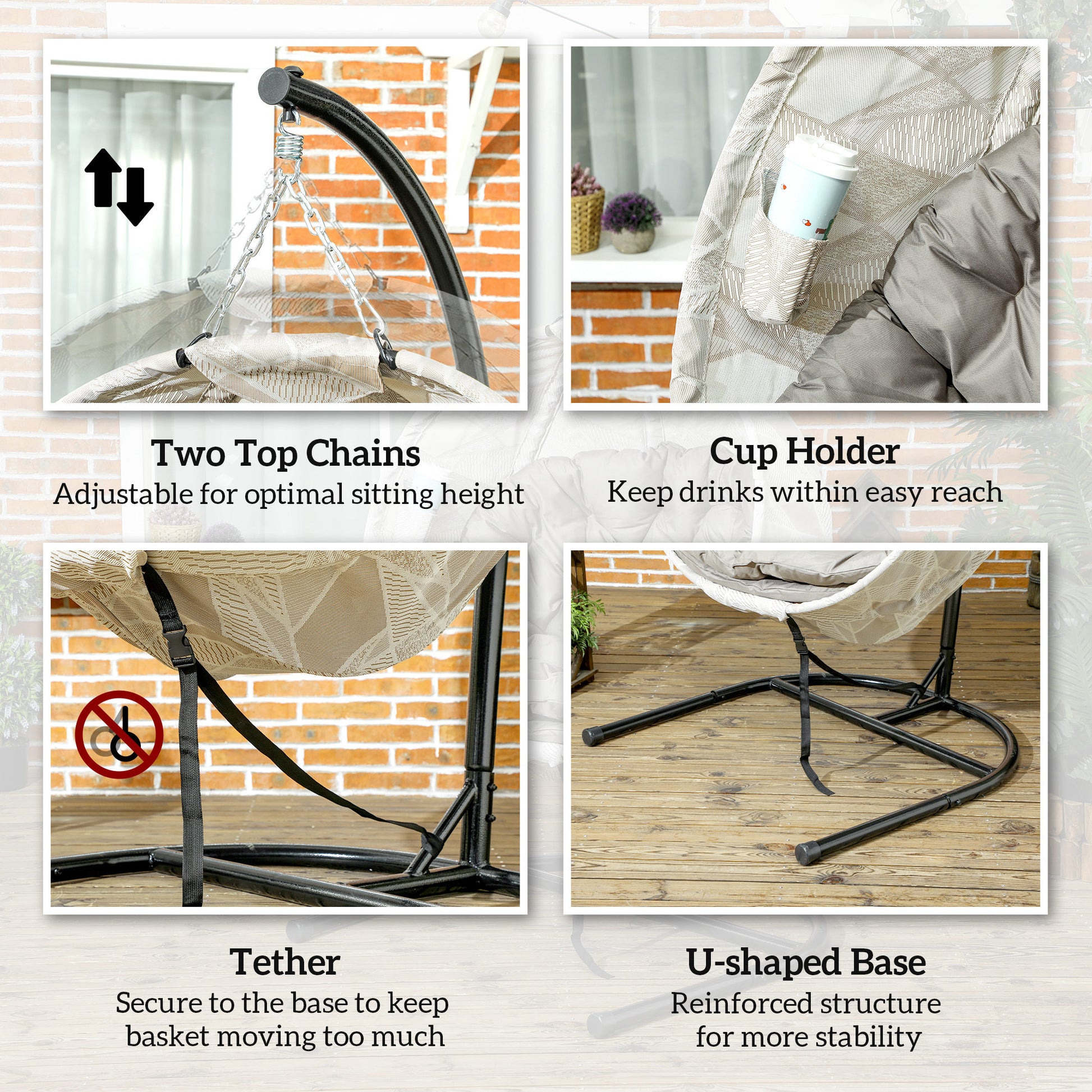 Relax in optimal comfort with this outdoor egg chair ! With a wide seat covered in geometric-pattern texteline fabric, this egg garden chair offers cosy, bird-nest-like retreat. The folding basket allows easy storage, with a cup holder keeping your drink close. A large 13 cm thickened cushion and a bottom cushion offer cloud-like comfort. Powder-coated steel frame and U-shaped base mean a stable swinging egg chair. Adjustable top chains customise your swinging experience.Specifications