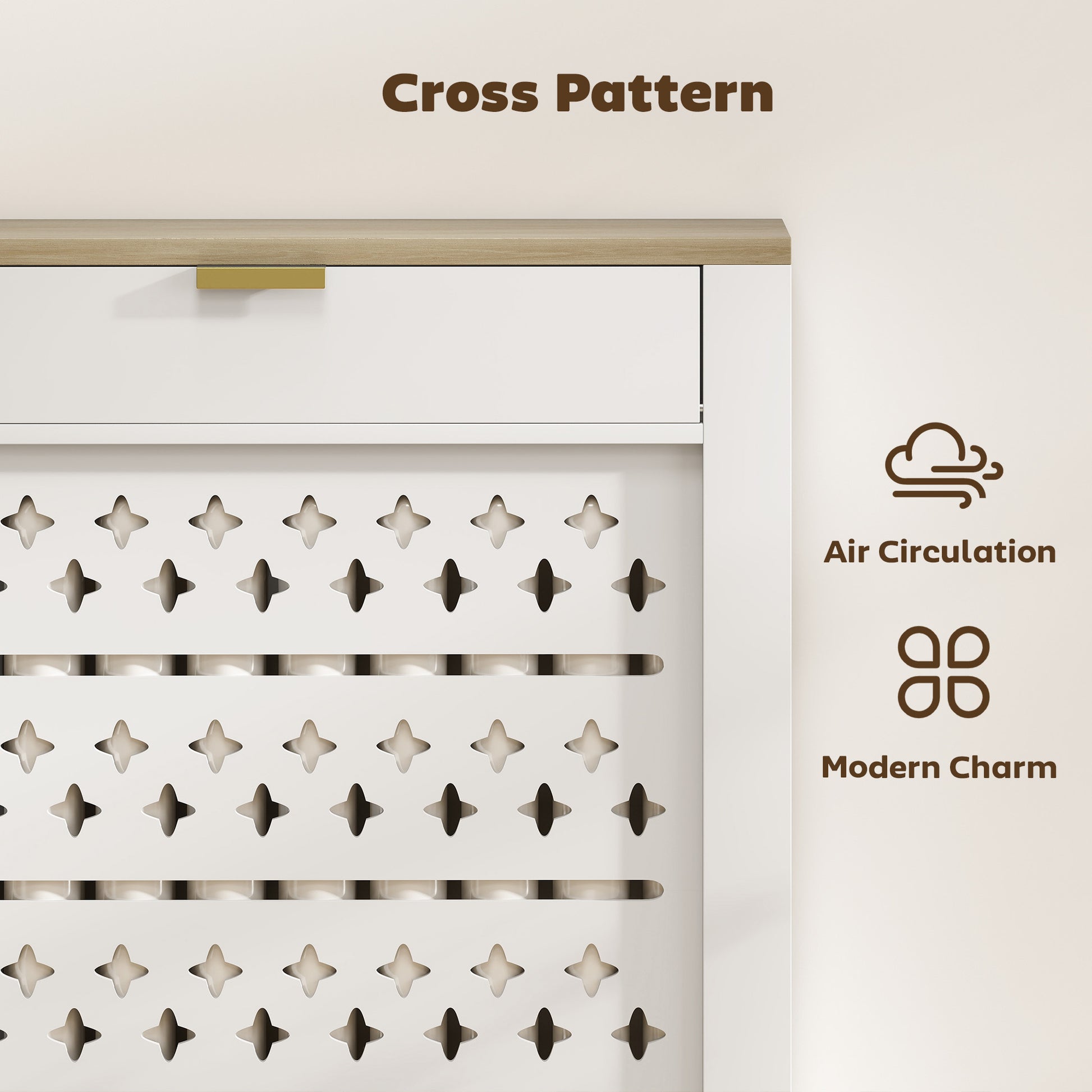 Safety ensured around radiators with this protective cover. Made from a particle board and MDF blend, this is a reliable piece made for everyday useit comes in a white body with a wood-effect for a simple design which looks great in plenty of different interior styles. The front cross cut-outs ensure heat can escape from the cover - so you can actually feel your radiator and keep warm as normal. It's complete with a top drawer for discreet storage.