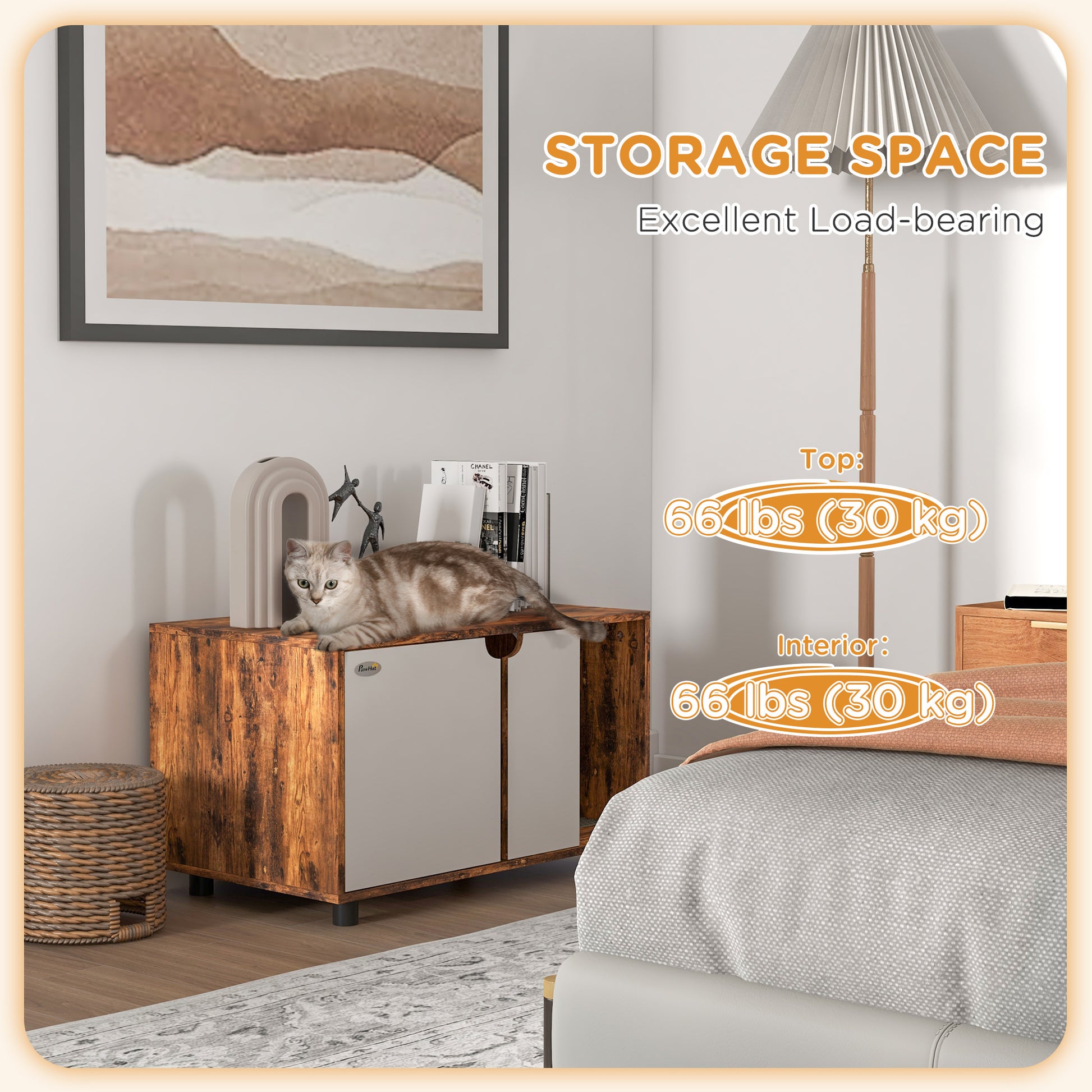 This cat litter box offers pet privacy, stops the spreading of unwanted smell and complements existing décor with its stylish design. You can even add a cosy bed inside, transforming it into a wonderful sleeping area for pets to enjoy. A wide tabletop for displaying your favourite pieces, adding beautiful decorations to your space. Its sand drain pad prevents litter from spreading, ensuring a mess-free room. Attend to your pet's litter needs with stylea win-win for you and your pet.