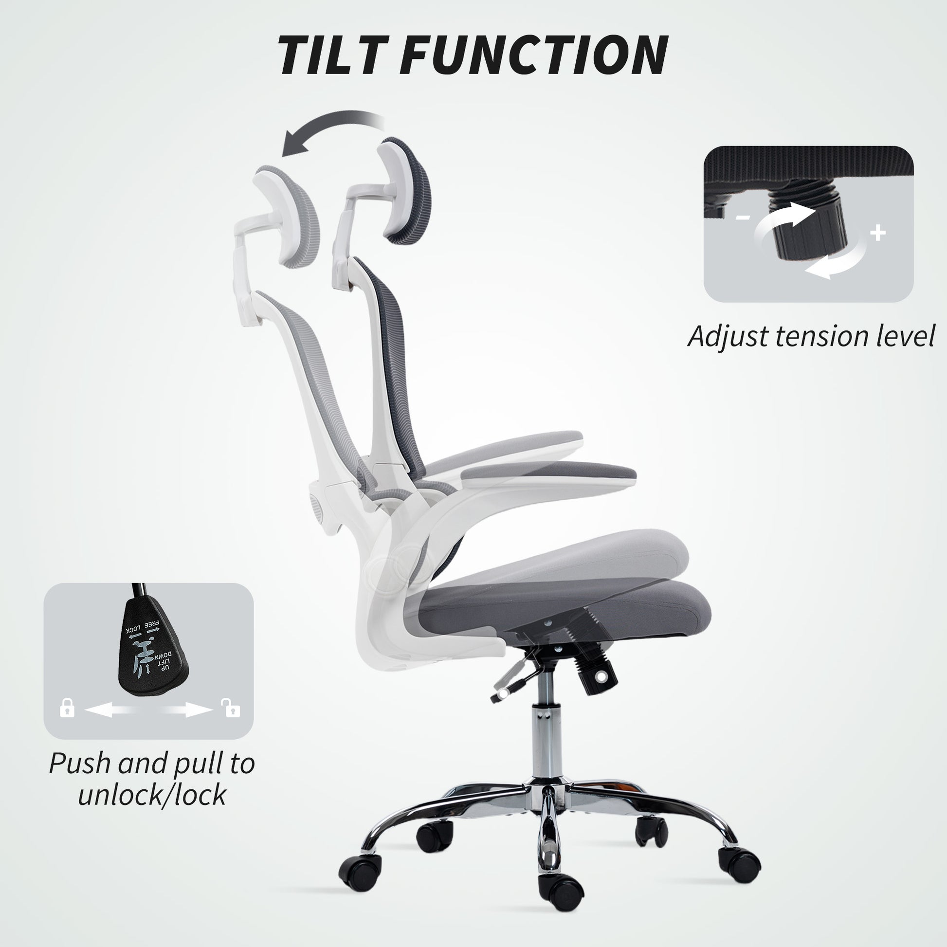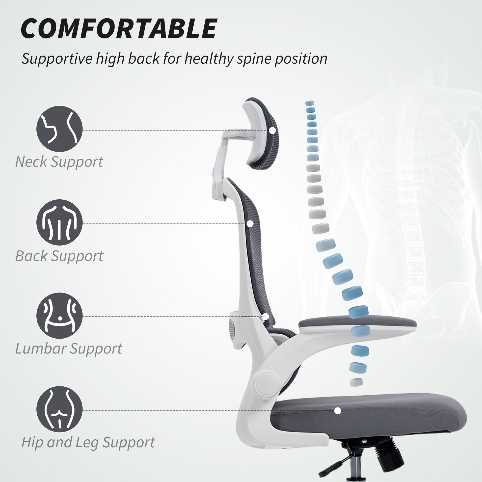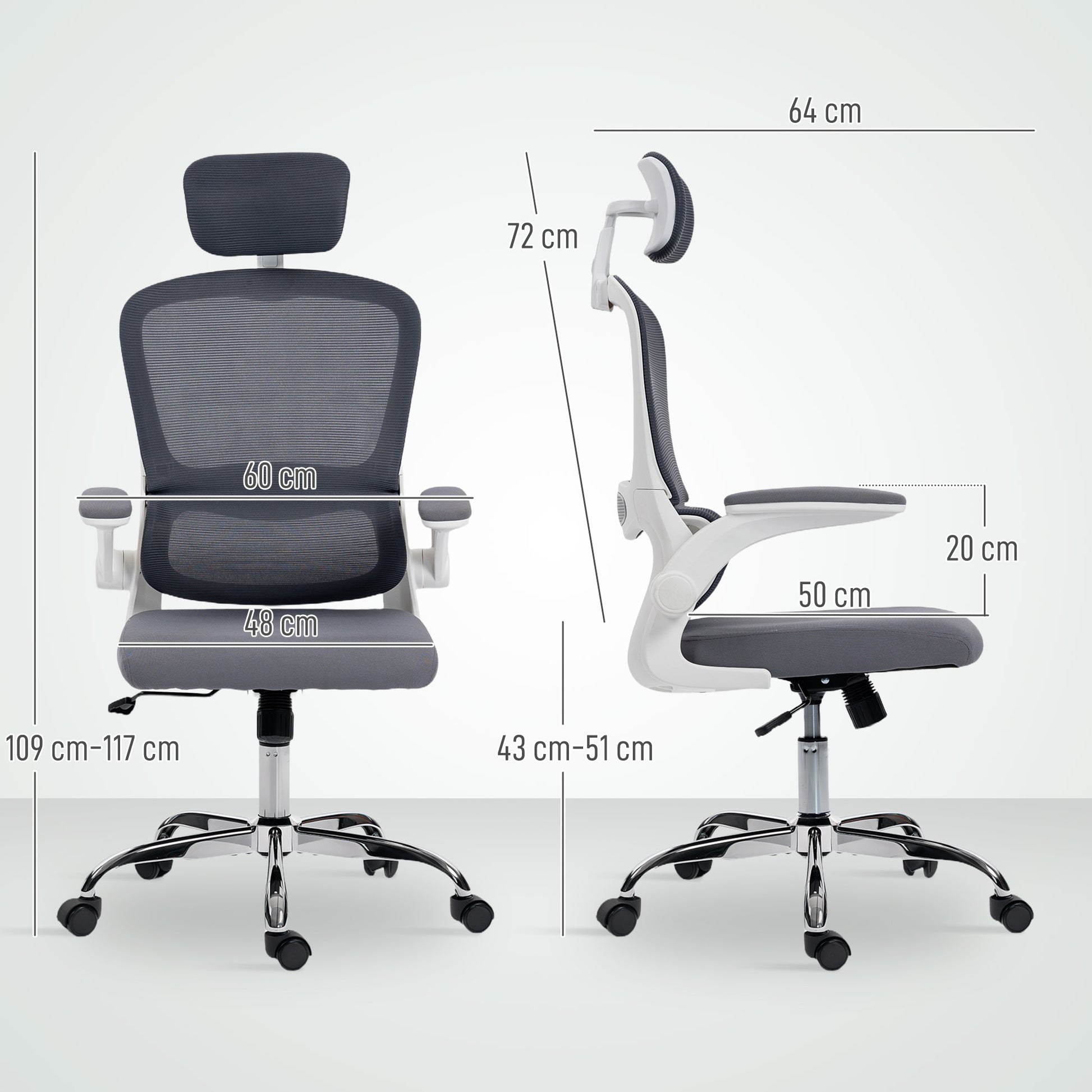 All day support as you work, with this office chair. A padded seat for comfort, with mesh fabric all over: this helps keep the chair and you as cool as possible. Set the seat between 43–51 cm to work at the level you want, with an adjustable headrest for head and neck support. It has lumbar support for your lower back. When done, all you have to do flip the armrests up so it fits underneath your desk.Specifications